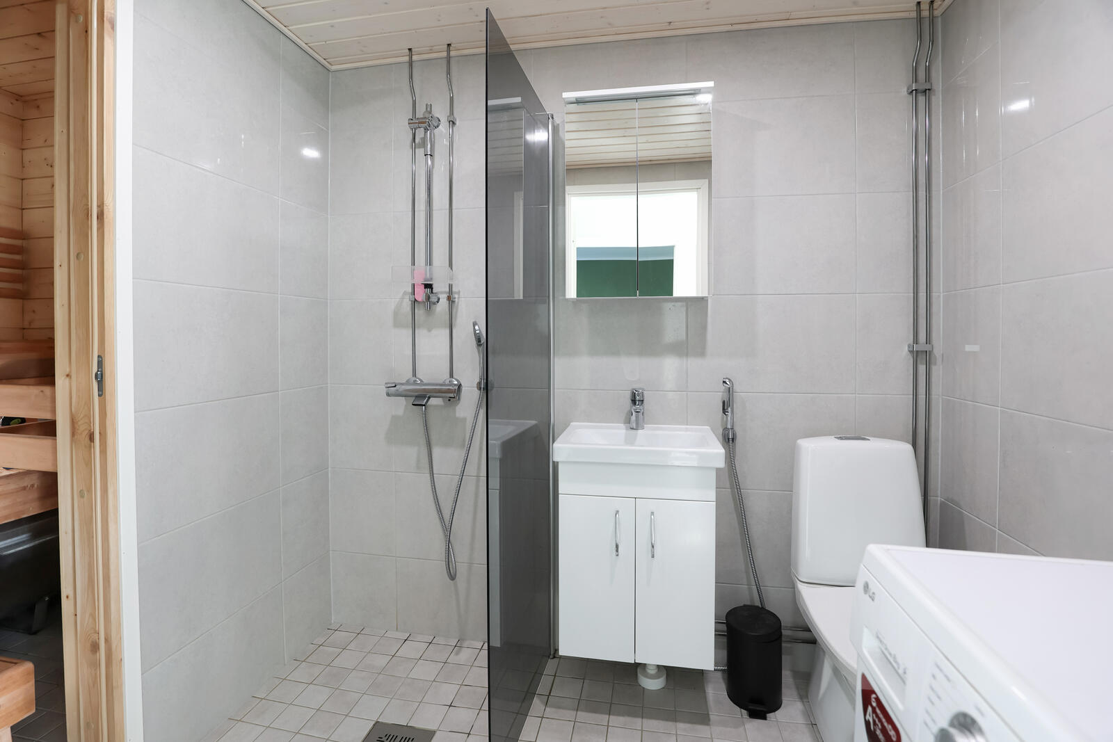 | Kylpyhuoneen kuvaus | WC-istuin (Uusittu 2023), suihku (Uusittu 2023), suihkuseinä (Uusittu 2023), pesukoneliitäntä (Uusittu 2023), lattialämmitys (Uusittu 2023), peilikaappi (Uusittu 2023), pesuallas (Uusittu 2023), bidee-suihku (Uusittu 2023) ja allaskaappi (Uusittu 2023), seinät (kaakeli), lattiat (laatta), Pesuhuone ja sauna saneerattu täydellisesti 2023. Laatoitetut seinät ja lattiat. |