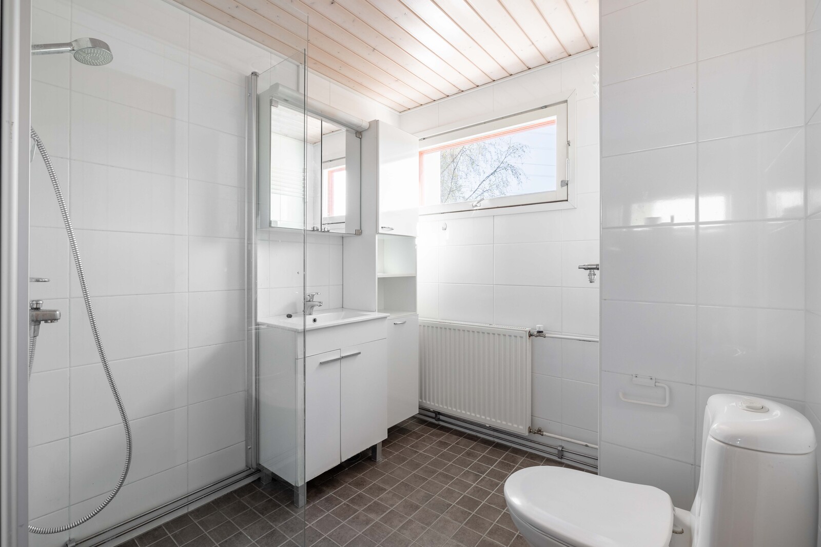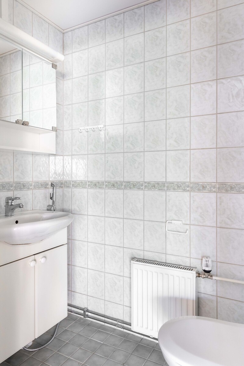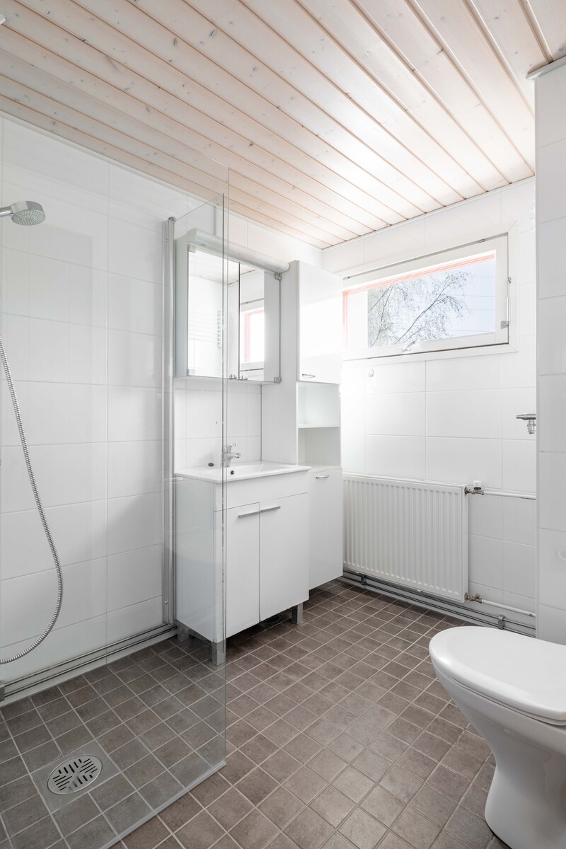 | Kylpyhuoneen kuvaus | Pesukoneliitäntä, suihkuseinä, peilikaappi, allaskaappi, suihku ja wc-istuin, seinät (kaakeli), lattiat (laatta) |