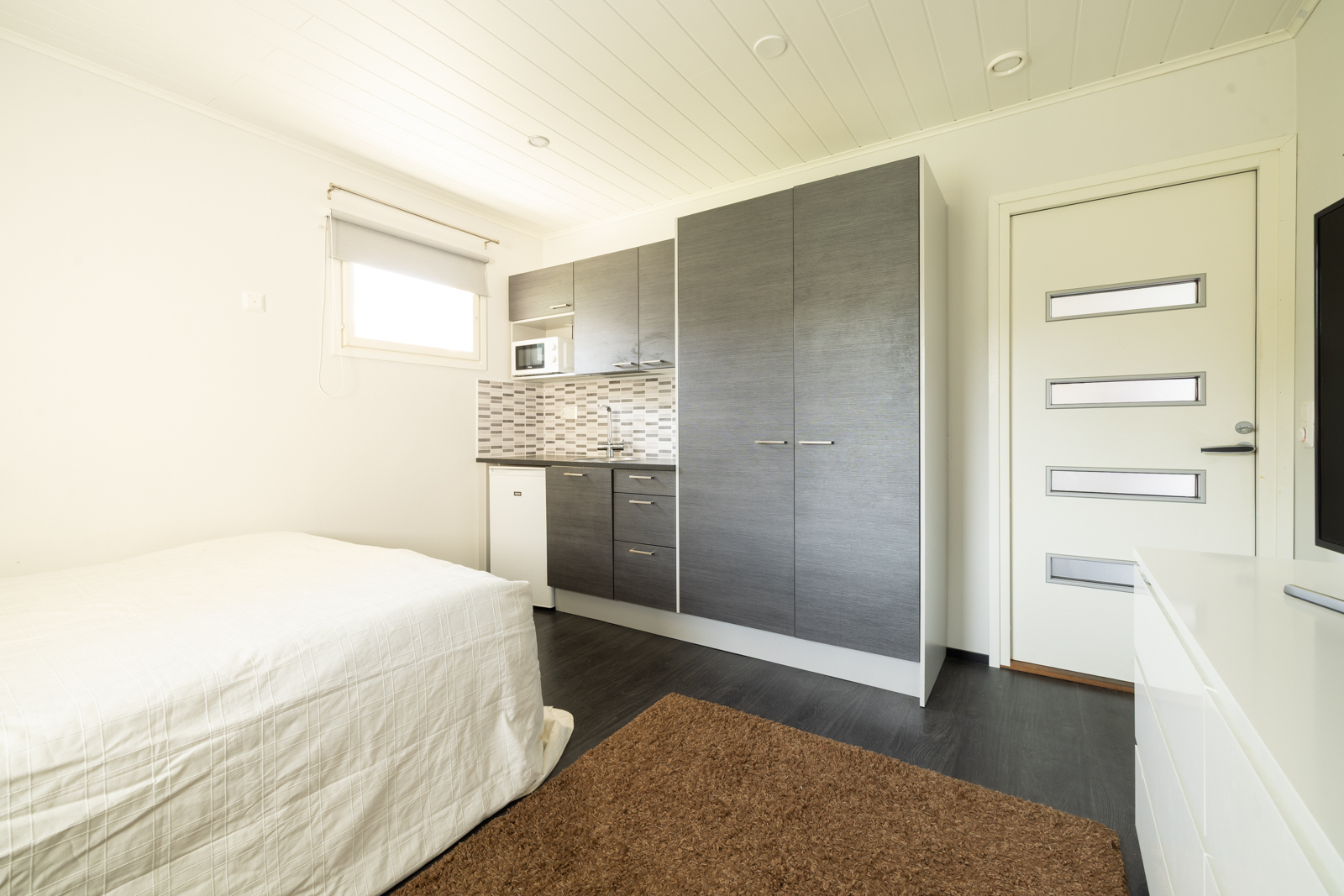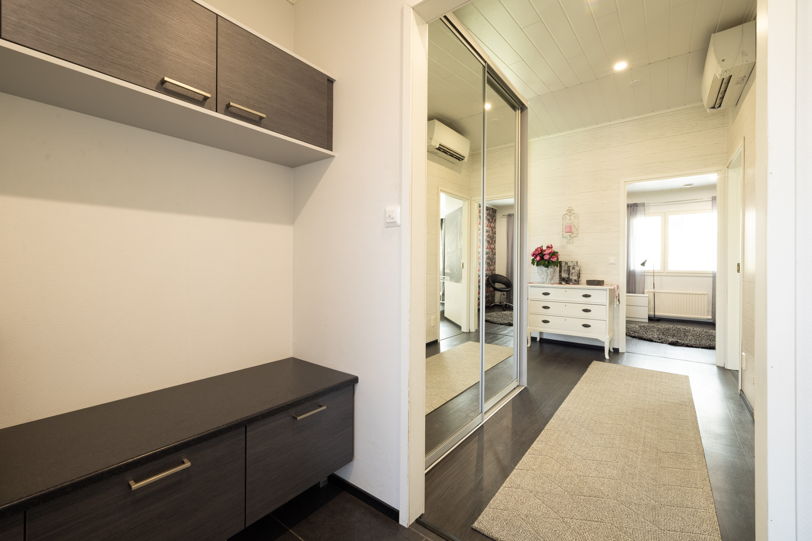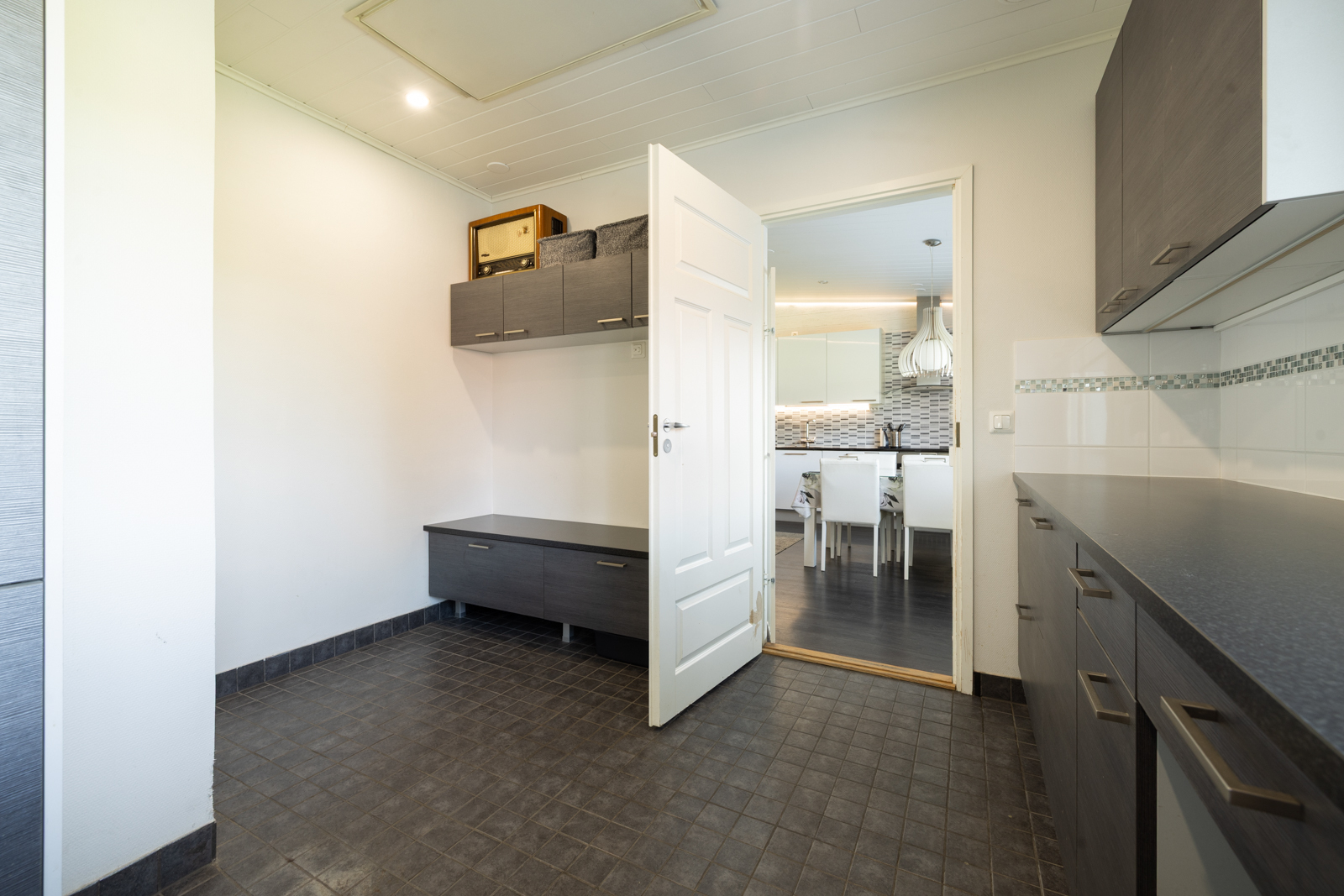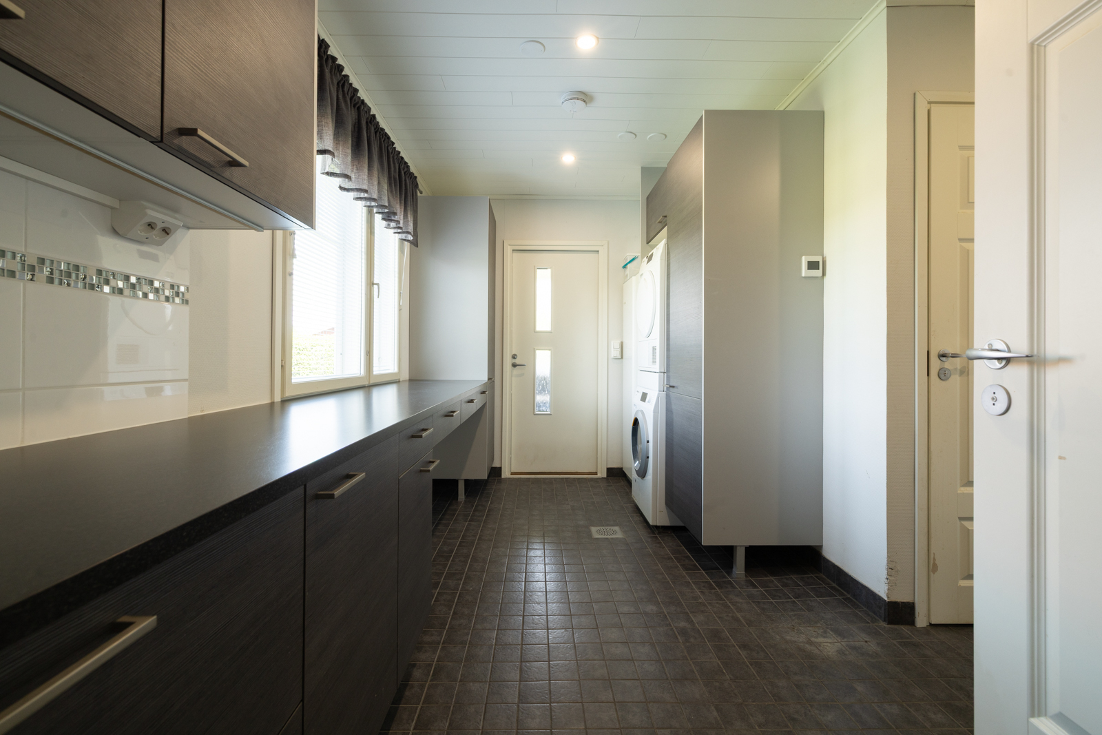 | Kodinhoitohuoneen kuvaus | Lattialämmitys ja pesukoneliitäntä, lattiat (laatta), seinät (lasikuitutapetti), Kiinteänä kalusteena penkki ja tila naulakolle. |