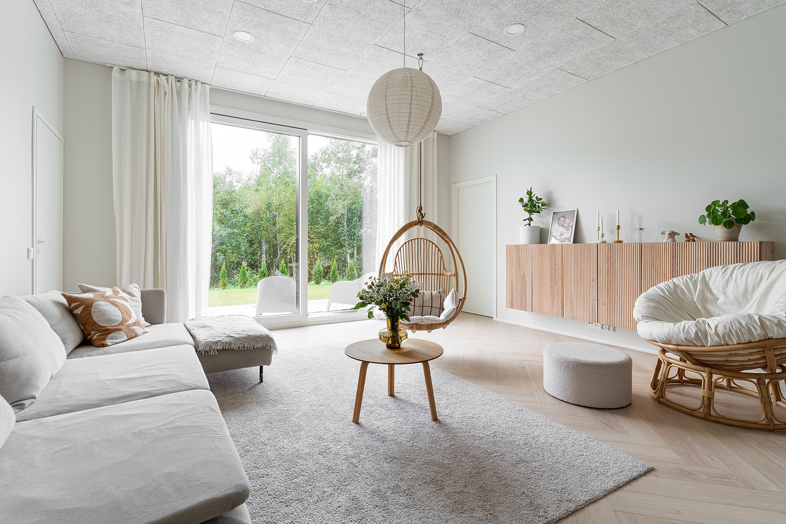Olohuoneessa 120×60 cm äänenvaimennuslevyt katossa |