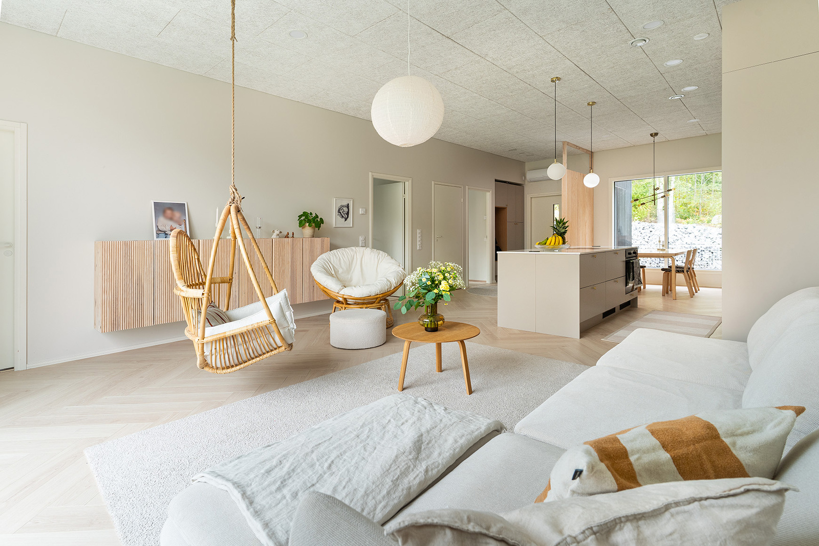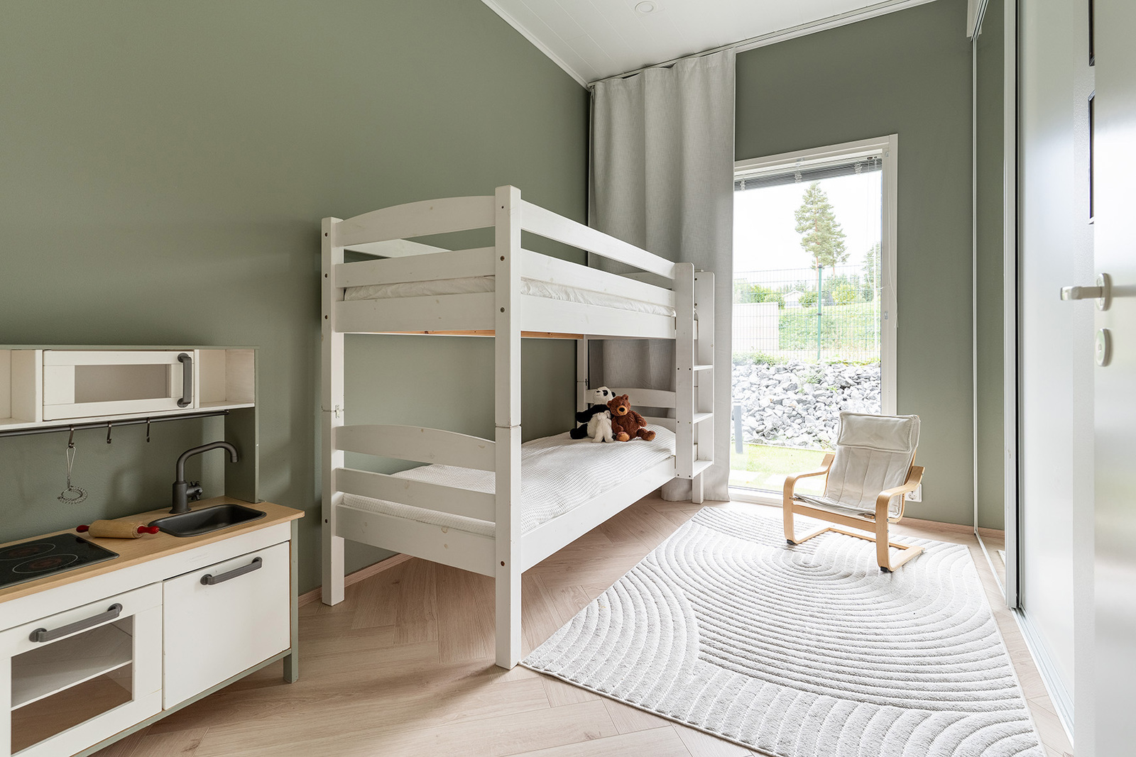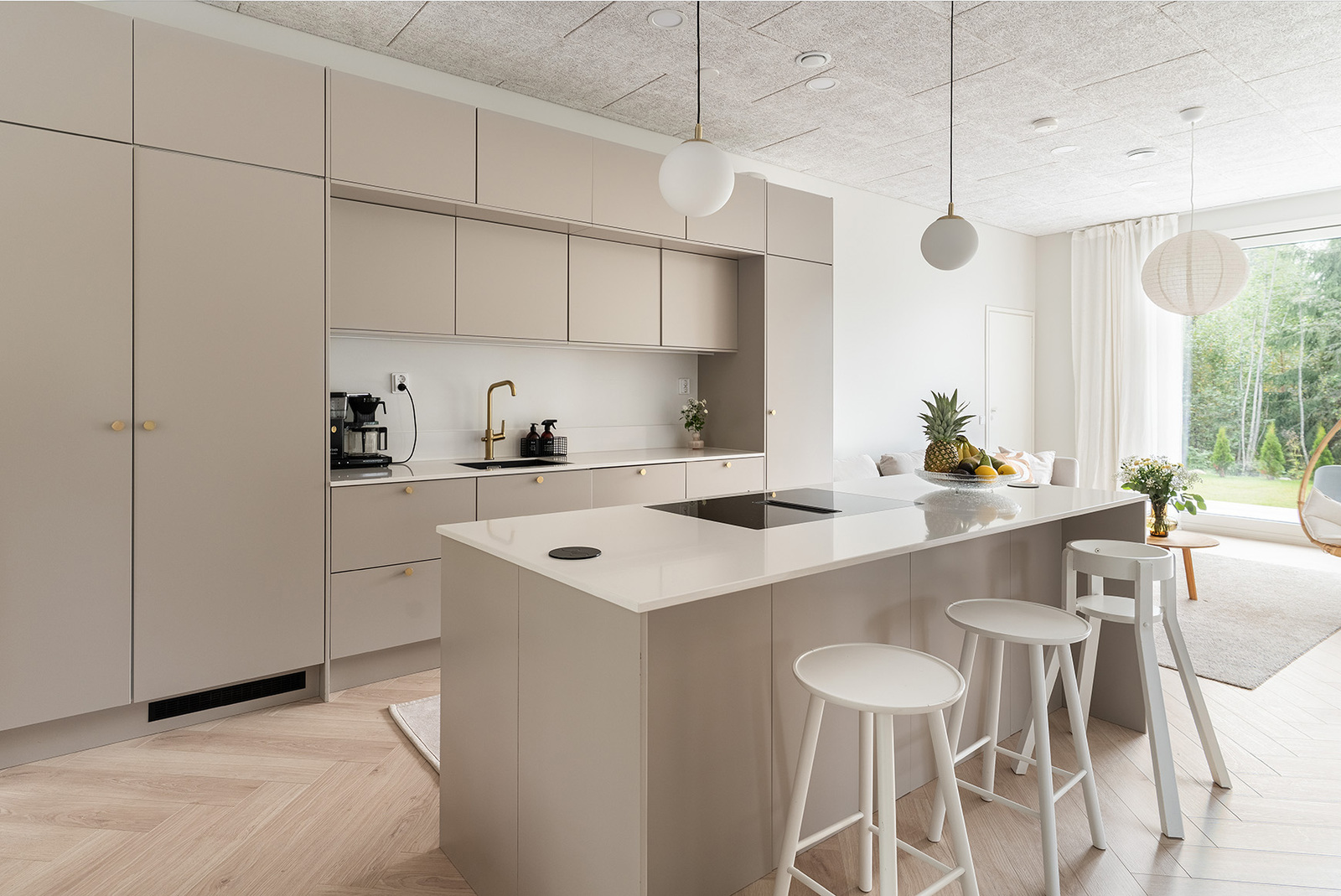 Avarasta olohuoneesta on liukuoven kautta käynti terassille, jossa voit nauttia rauhallisista hetkistä luonnon äärellä. Keittiö on varustettu laadukkailla kodinkoneilla, ja kvartsikomposiittitasot tuovat ripauksen ylellisyyttä arkeen. Kolme makuuhuonetta ja käytännöllinen kodinhoitohuone tekevät arjesta sujuvaa.