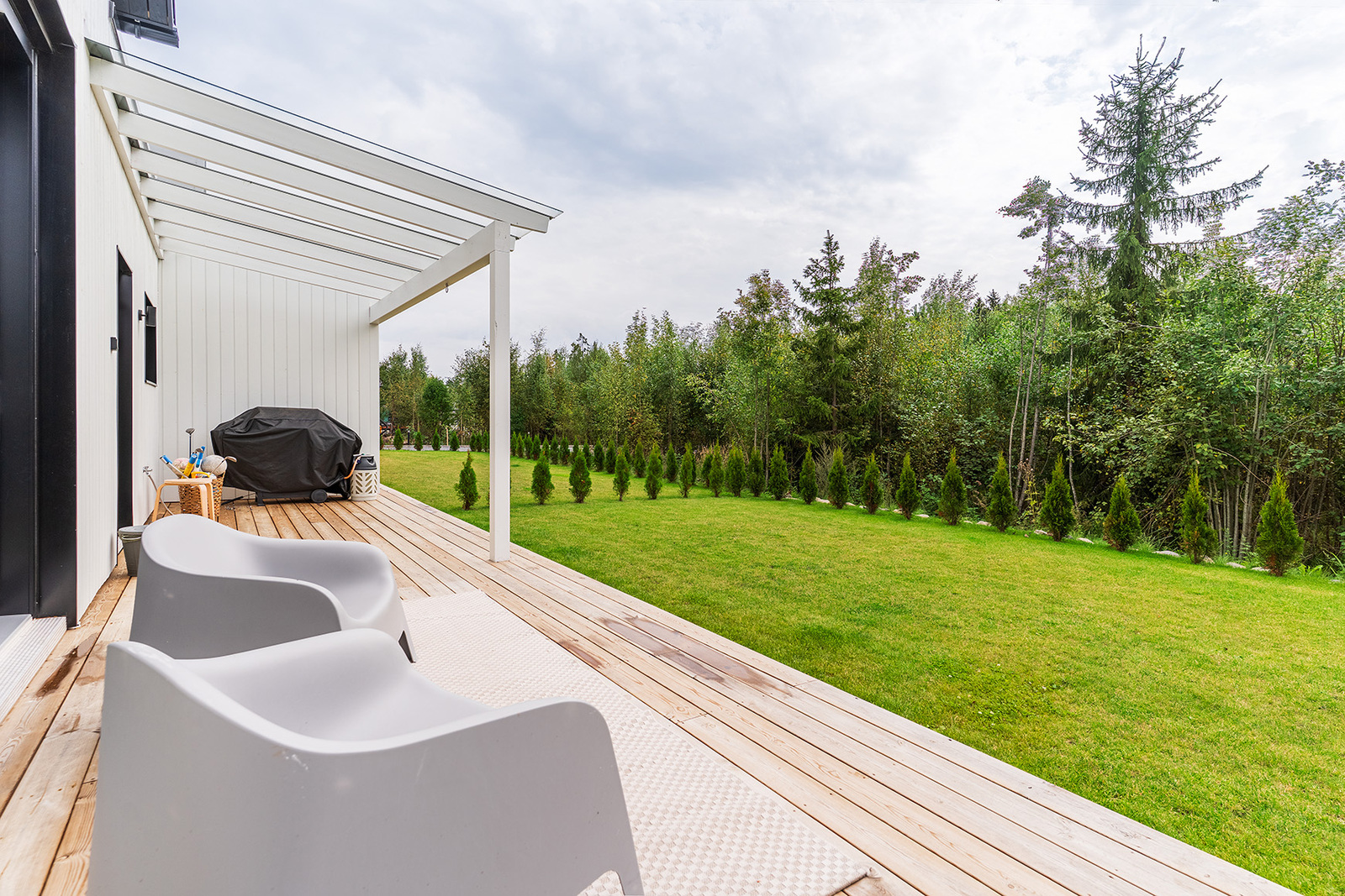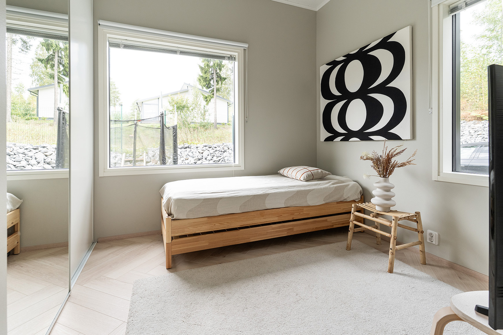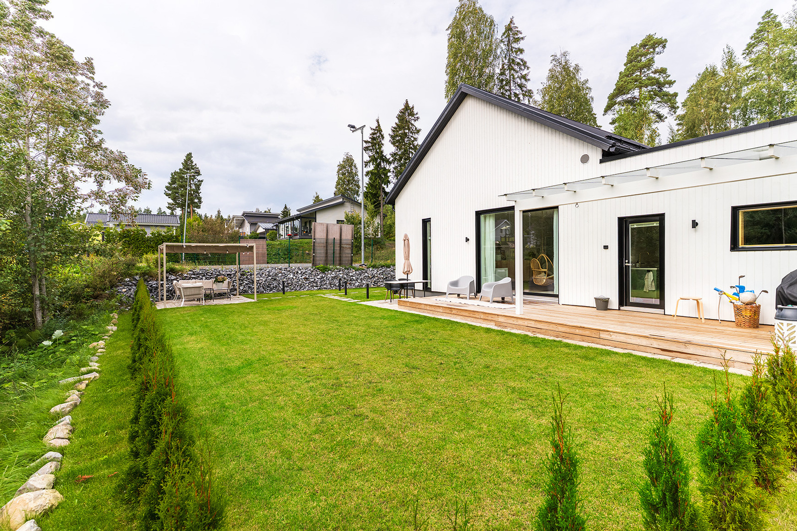 Avarasta olohuoneesta on liukuoven kautta käynti terassille, jossa voit nauttia rauhallisista hetkistä luonnon äärellä. Keittiö on varustettu laadukkailla kodinkoneilla, ja kvartsikomposiittitasot tuovat ripauksen ylellisyyttä arkeen. Kolme makuuhuonetta ja käytännöllinen kodinhoitohuone tekevät arjesta sujuvaa.