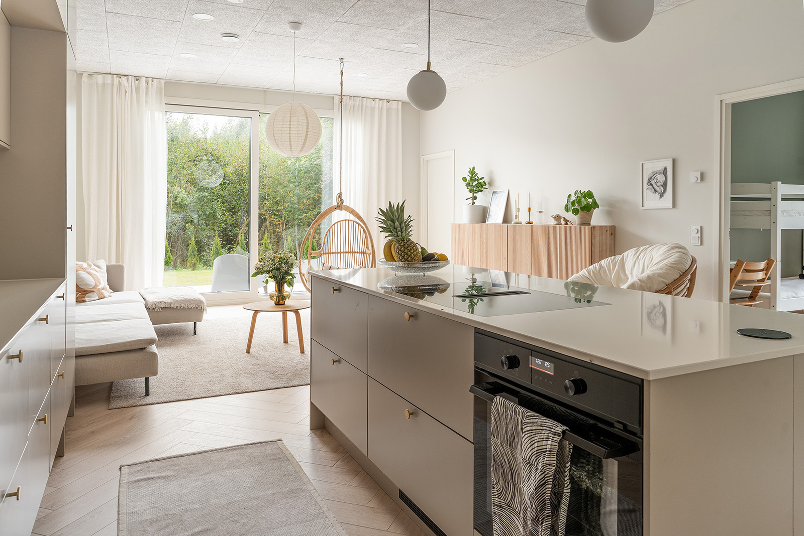 Liesi (liesitaso, erillisuuni ja induktioliesi), työtasot (kvartsikomposiitti), seinät (maali), lattiat (laminaatti), astianpesukone, liesituuletin, erillisuuni, jääkaappi, erillinen pakastin ja kiinteät valaisimet, liesitaso |