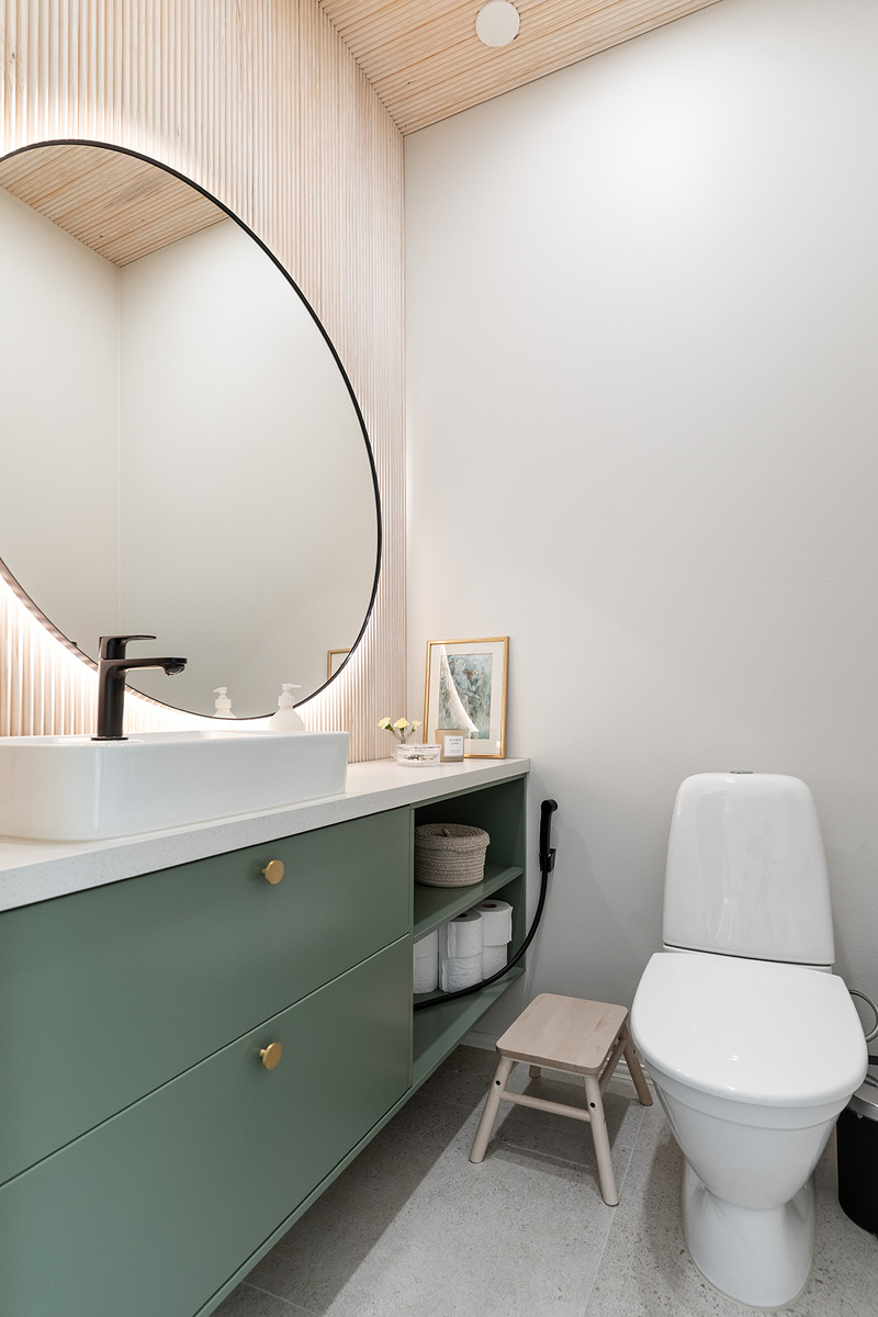 Bidee-suihku, lattialämmitys, wc-istuin, peili ja pesuallas, seinät (Puu ja maali), lattiat (Laatta) |