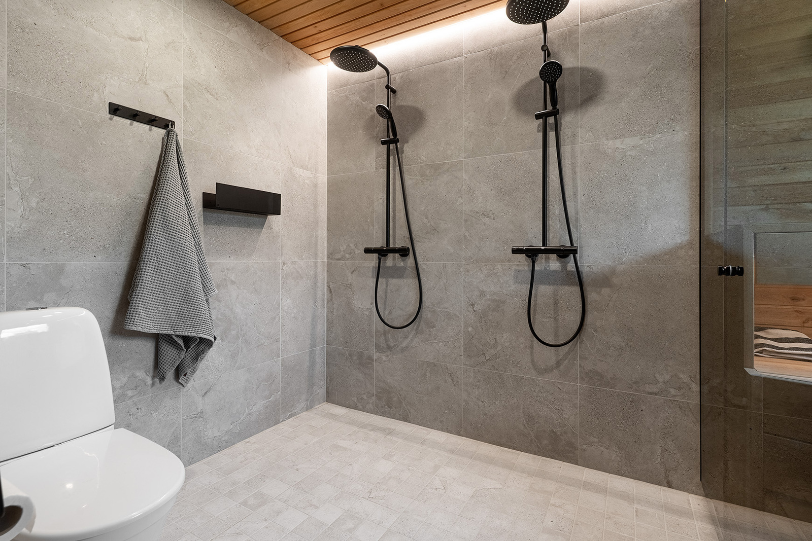 Lattialämmitys, wc-istuin, suihku ja kiinteät valaisimet, seinät (kaakeli), lattiat (laatta) |