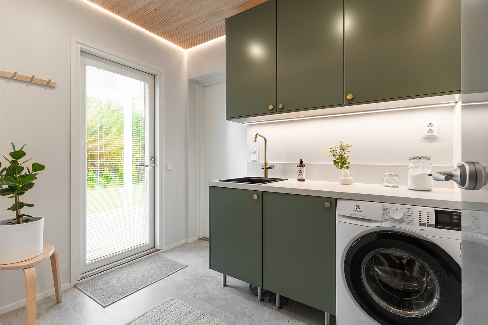 Pesuallas, pesukoneliitäntä, lattiakaivo, lattialämmitys, pyykkikaapit ja pöytätaso, lattiat (laatta), seinät (maali), sormipaneelikatto |