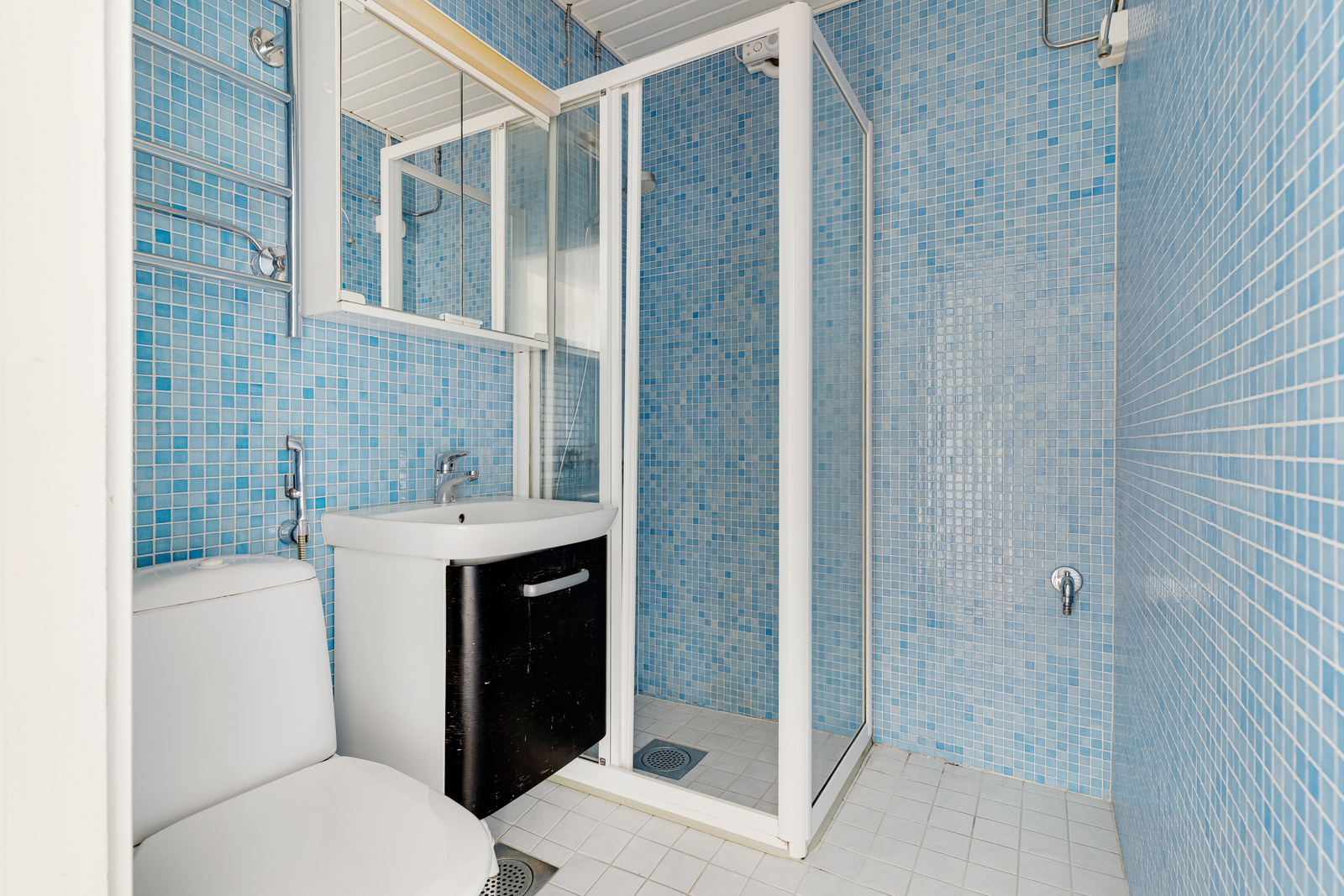 WC-istuin, pesukoneliitäntä, suihkuseinä, peilikaappi ja kiinteät valaisimet, seinät (kaakeli), lattiat (laatta) |