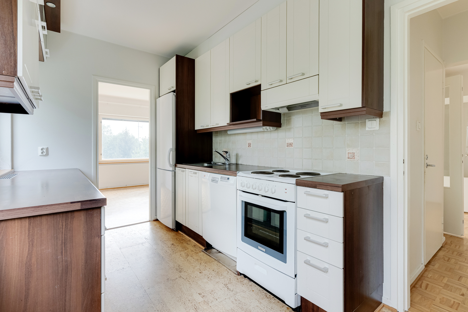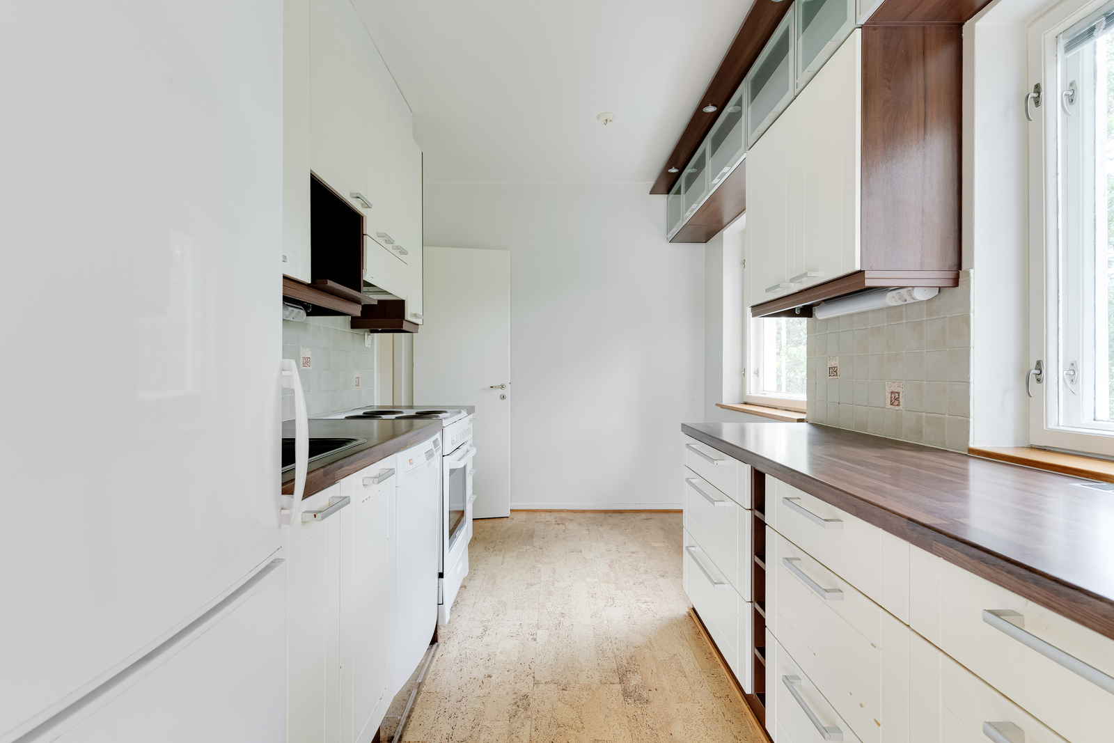 Liesi (sähköliesi), työtasot (laminaatti), seinät (maali), lattiat (korkki), jääkaappipakastin, liesituuletin, liesi, astianpesukone ja kiinteät valaisimet |