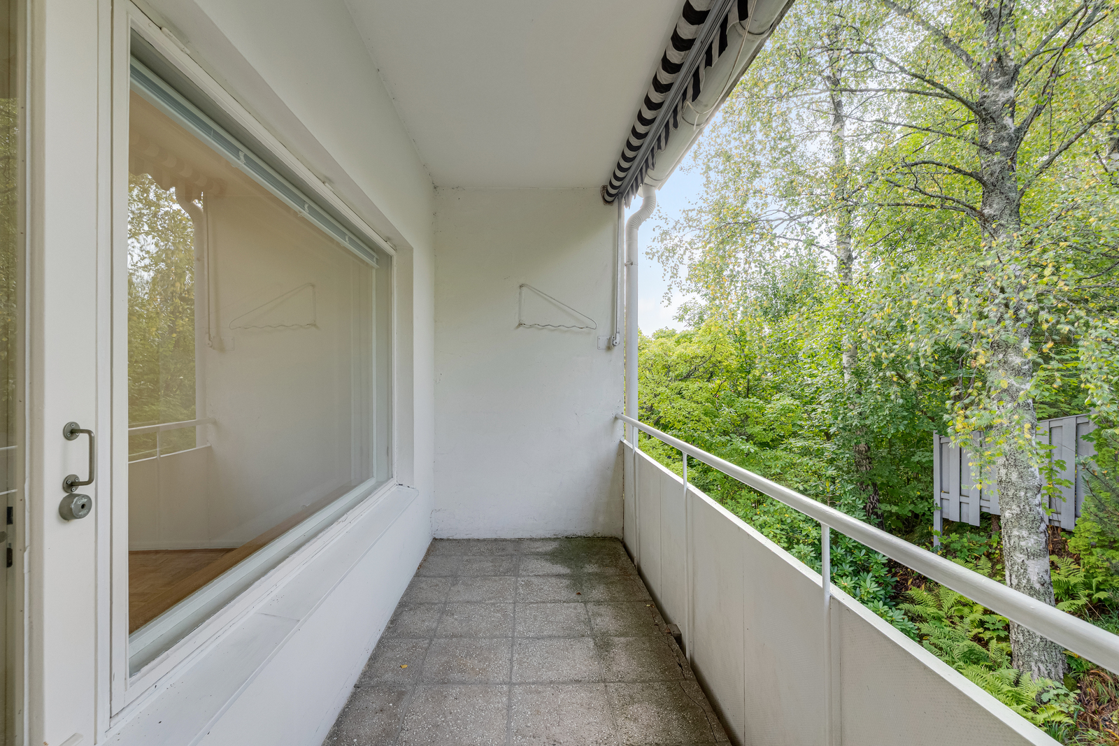 Ylimmän kerroksen koti on tilava ja todella valoisa. Sisään astut avaraan eteishalliin, josta käynti lasisten pariovien kautta olohuoneeseen, jonka jatkeena on parveke. Keittiössä on kaksi isoa ikkunaa ja sen vieressä on monikäyttöinen huone. Makuuhuoneita on kolme, pienin niistä soveltuu hyvin vaikka työhuoneeksi.