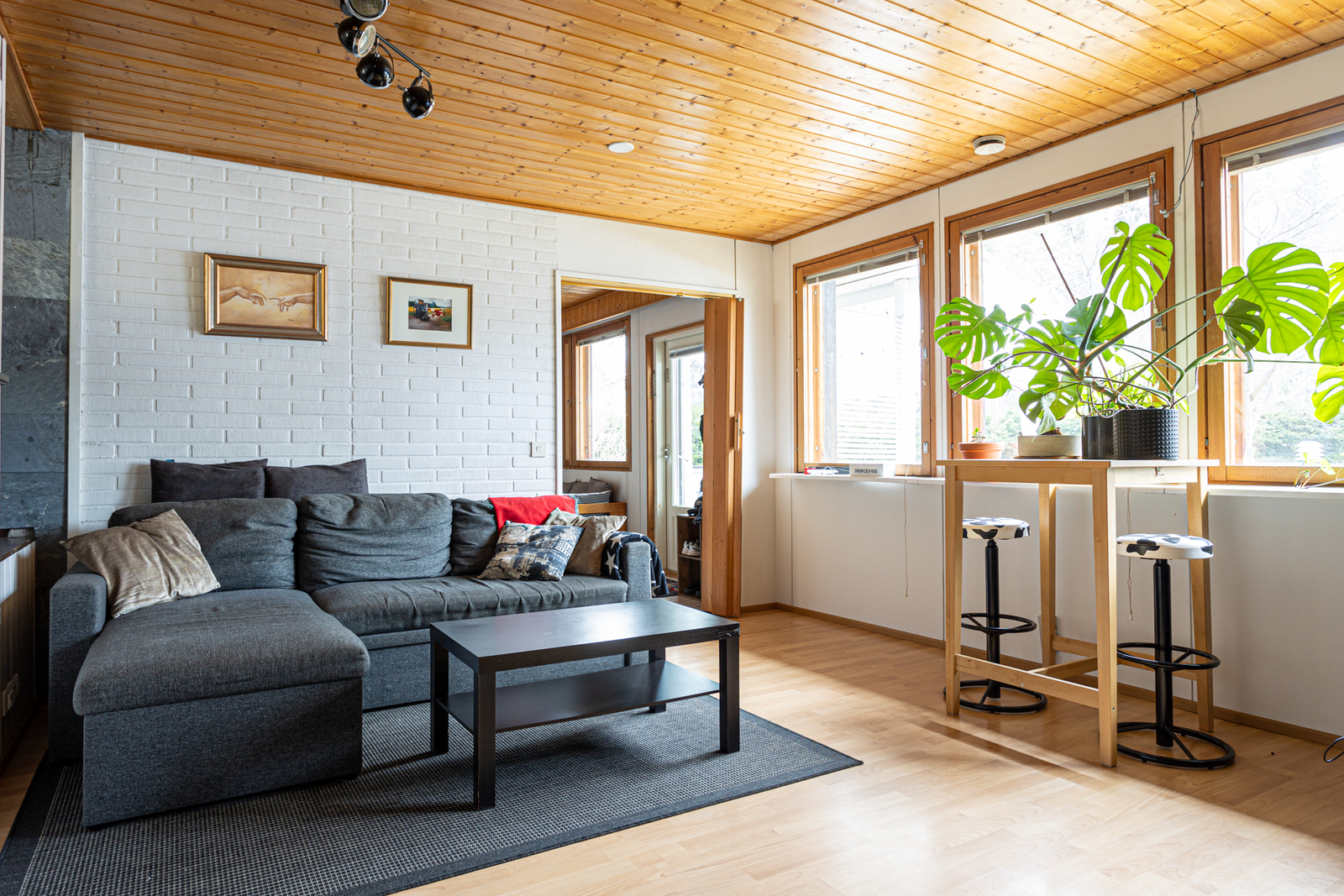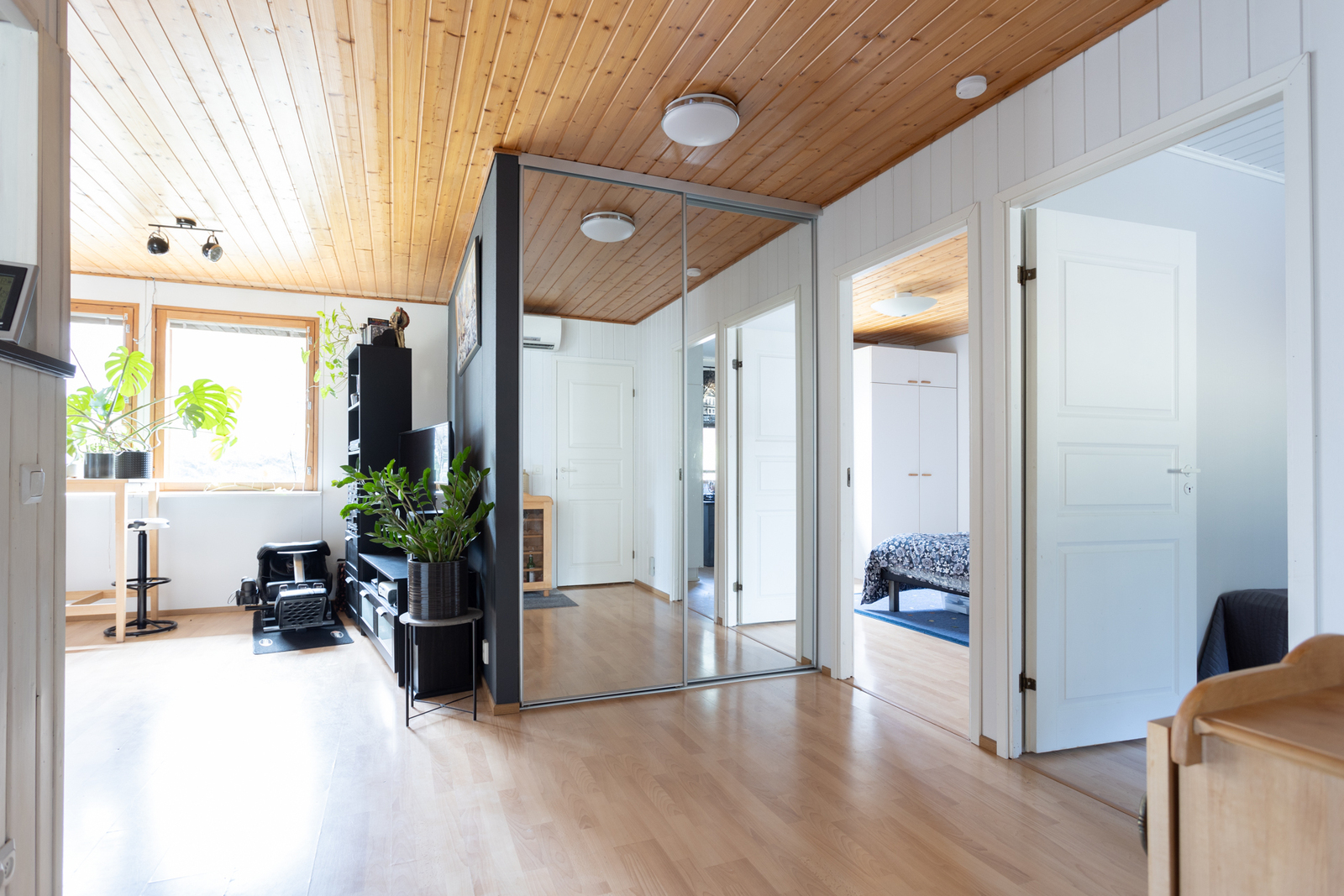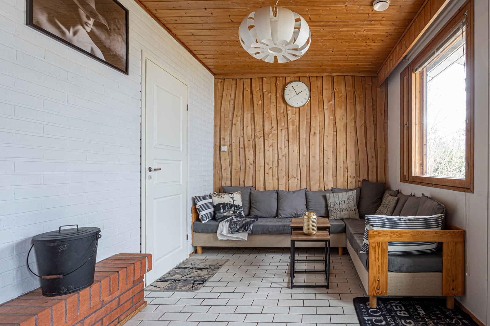 | Muut huoneet ja tilat | Yhden makuuhuoneen seinissä maalia ja tapettia toisen makuuhuoneen seinät maalattu, toisen katossa paneeli ja toisen maalattu paneeli. Takkahuoneen lattiassa laatta, yksi seinä tammiseinä, tiiliseinä ja loput maalattu, katossa paneeli. Tuulikaapin lattiassa laatta, seinät maalattu ja katossa paneeli. Aulan lattiassa laminaatti, seinissä puupaneeli ja katossa paneeli. |