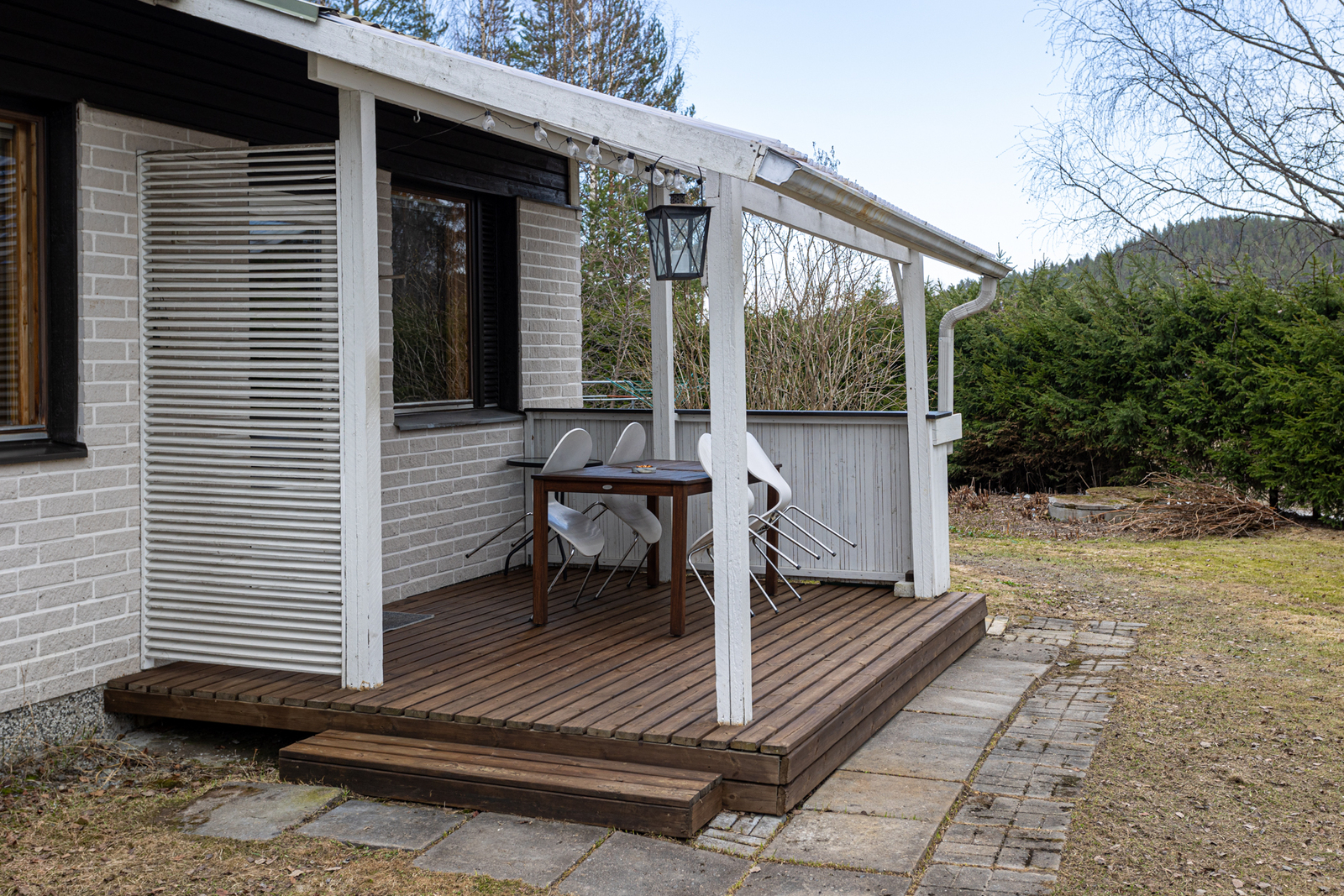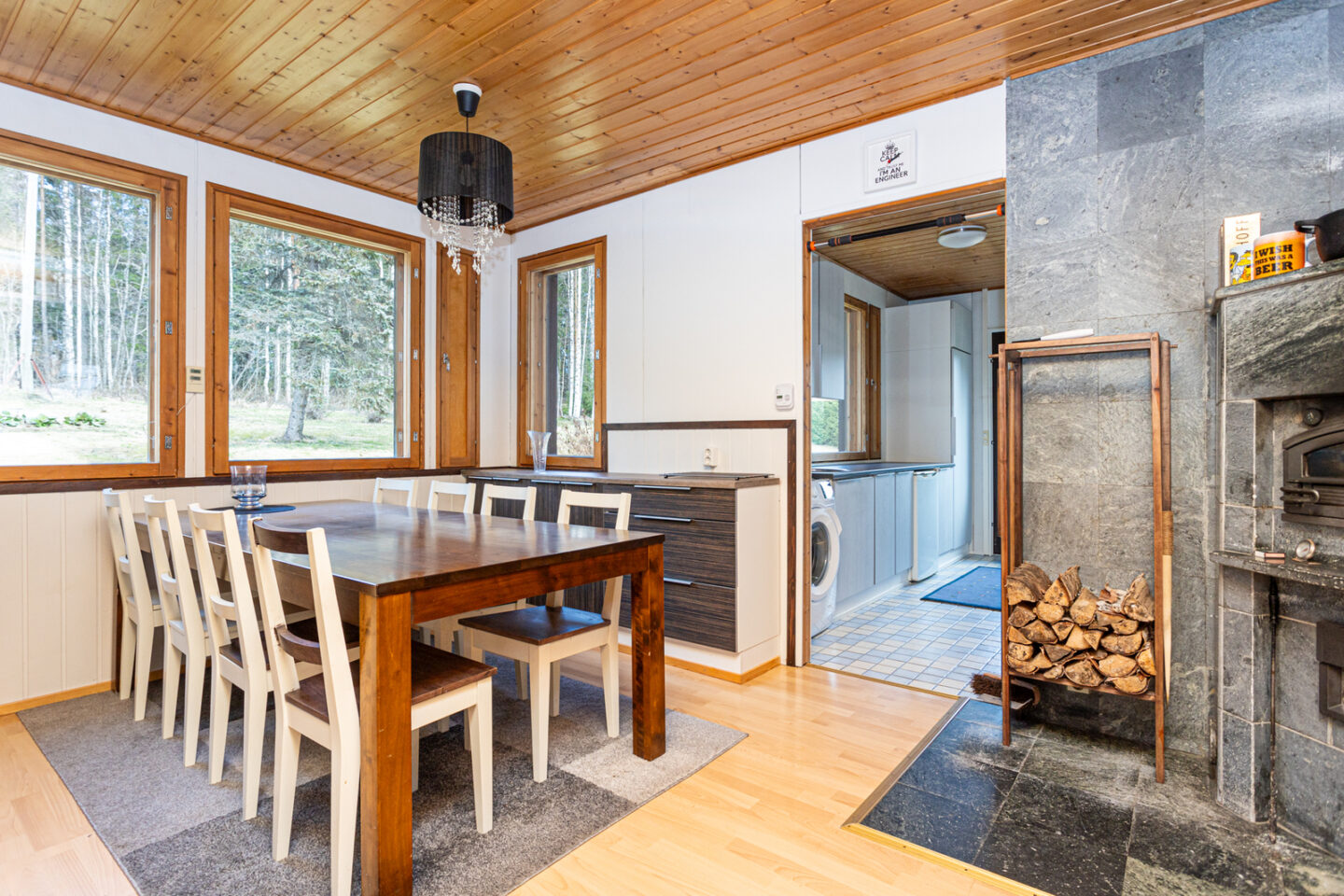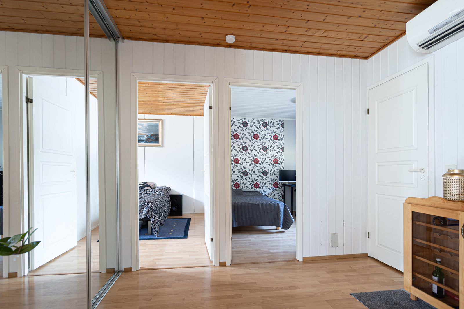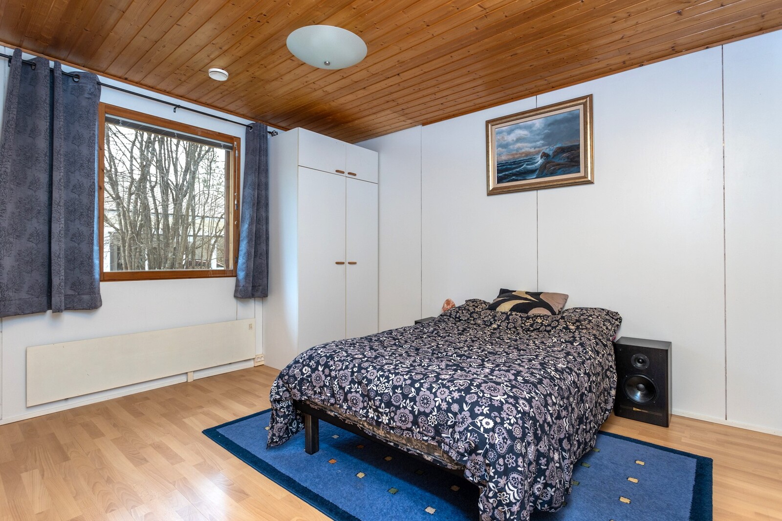 | Muut huoneet ja tilat | Yhden makuuhuoneen seinissä maalia ja tapettia toisen makuuhuoneen seinät maalattu, toisen katossa paneeli ja toisen maalattu paneeli. Takkahuoneen lattiassa laatta, yksi seinä tammiseinä, tiiliseinä ja loput maalattu, katossa paneeli. Tuulikaapin lattiassa laatta, seinät maalattu ja katossa paneeli. Aulan lattiassa laminaatti, seinissä puupaneeli ja katossa paneeli. |