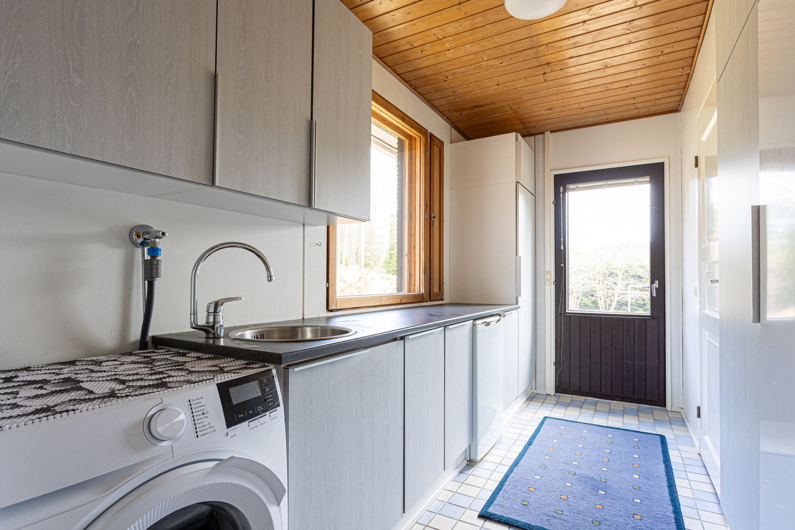 Kodinhoitohuoneessa mukavasti tilaa, joka hoitaa myös apukeittiön tarpeen, kodin pyykkiasiat hoituvat sutjakkaasti, käynti suoraan ulos, lämminvesivaraaja uusittu 2012 vuonna.