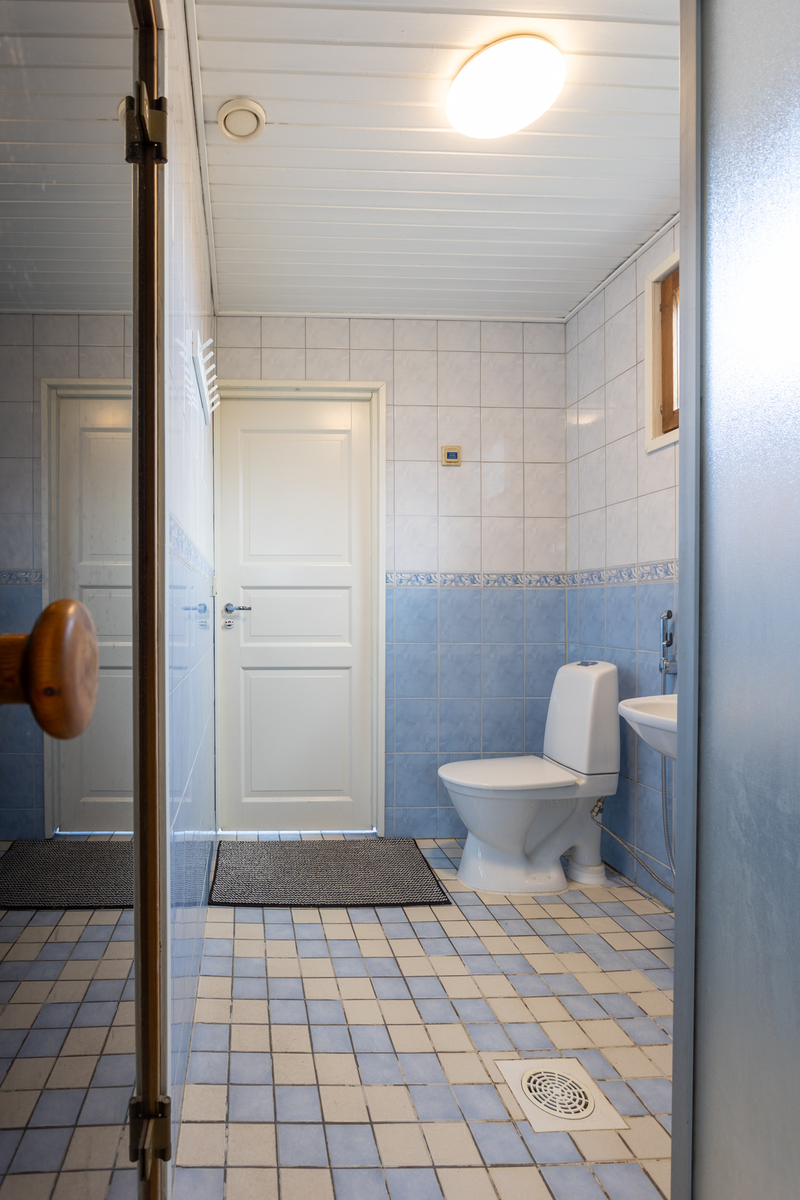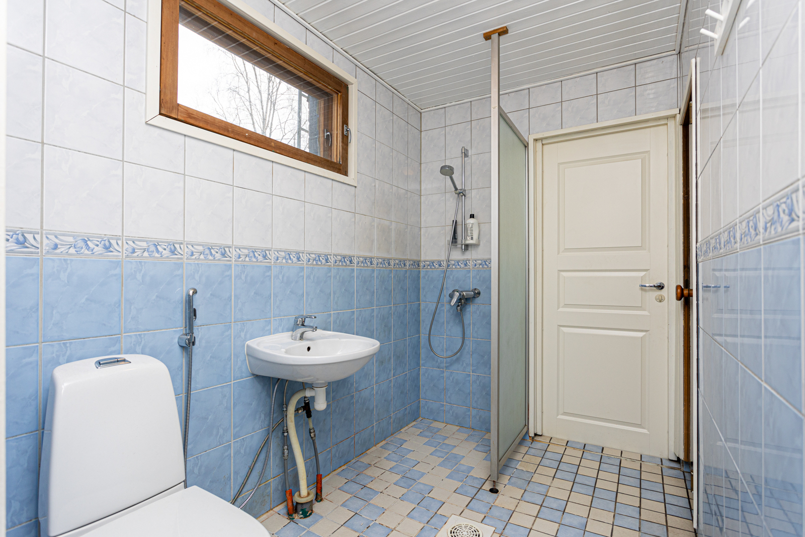 | Kylpyhuoneen kuvaus | Lattialämmitys, wc-istuin, suihku ja kiinteät valaisimet, lattiat (laatta), Seinät laatoitettu ja katto paneloitu. |