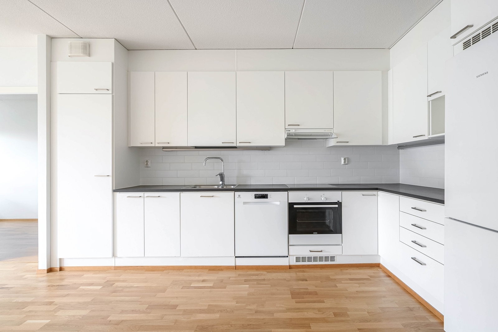 | Keittiön kuvaus | Liesi (Keraaminen liesi ja erillisuuni, liesitaso), työtasot (laminaatti), seinät (maali), lattiat (parketti), jääkaappi, erillisuuni, liesituuletin, erillinen pakastin, astianpesukone ja liesitaso |
