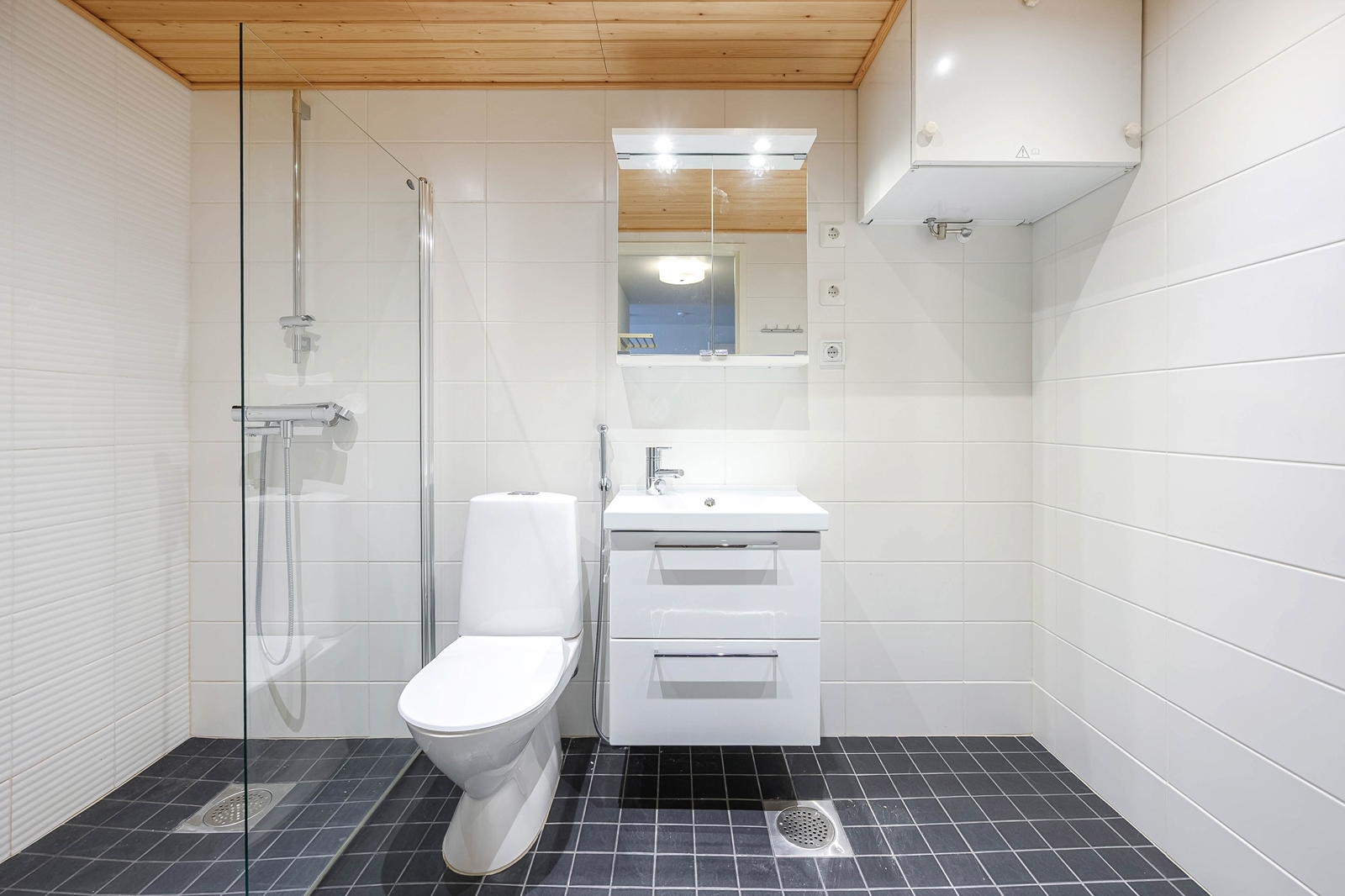 | Kylpyhuoneen kuvaus | Peilikaappi, suihkuseinä, allaskaappi, wc-istuin, suihku ja pesukoneliitäntä, seinät (kaakeli), lattiat (laatta) |
