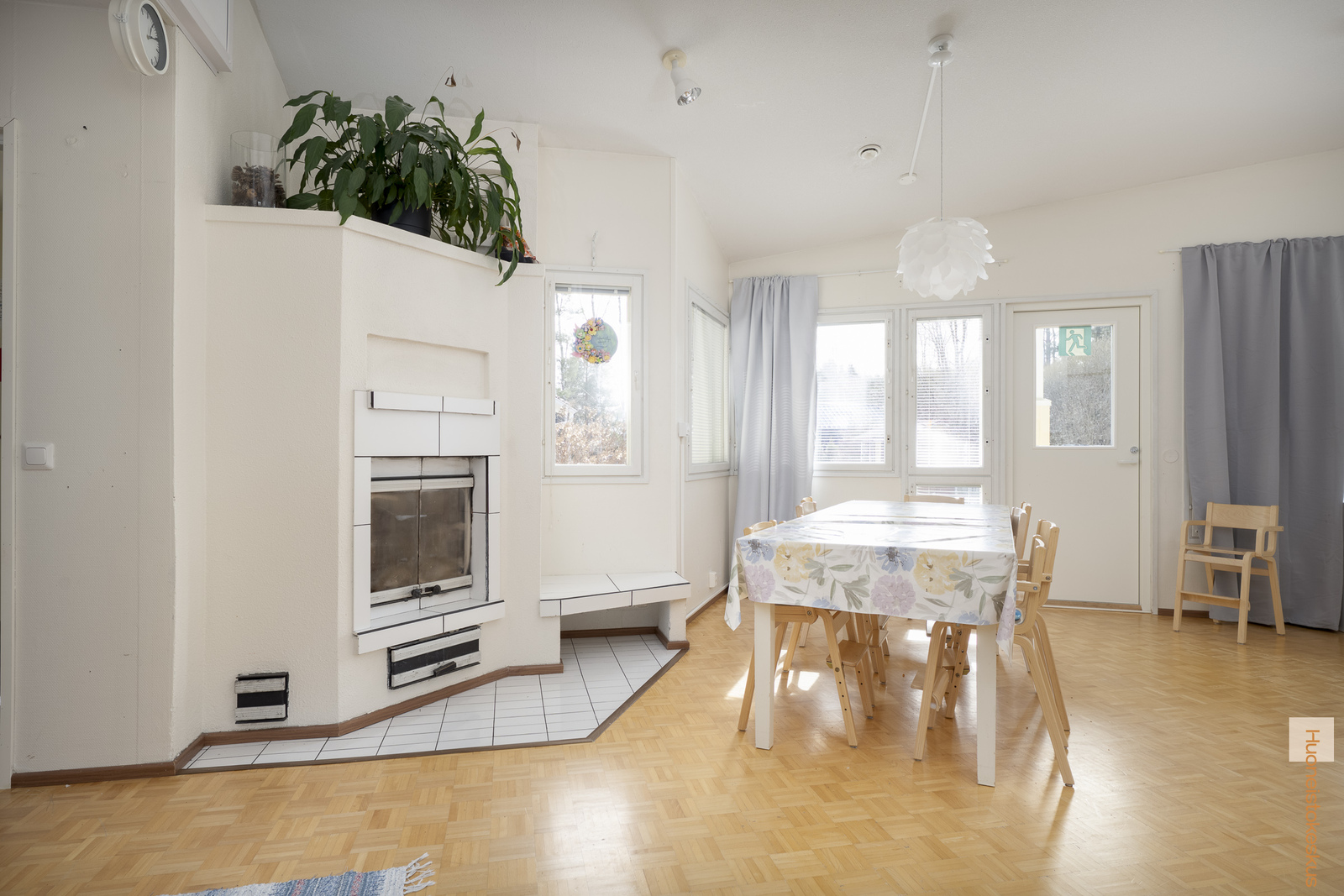 | Olohuoneen kuvaus | Seinät (lasikuitutapetti), lattiat (parketti), Olohuoneessa varaava takka. |