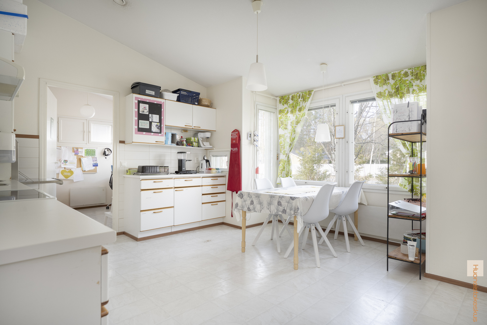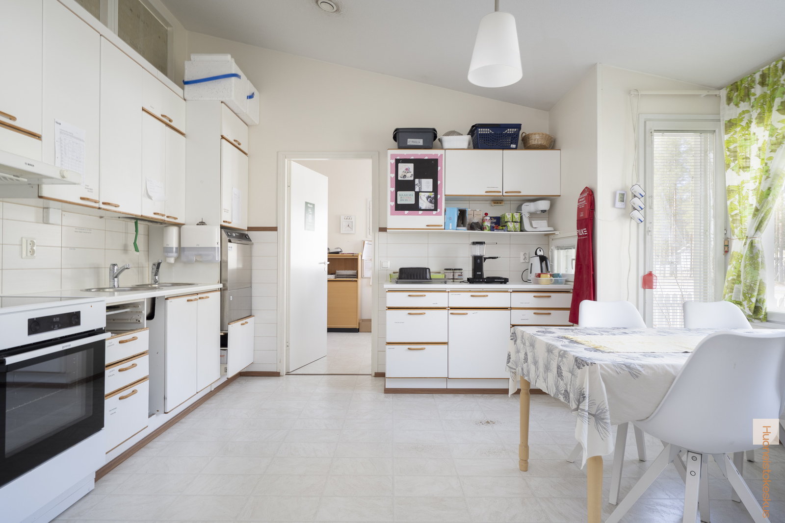 | Keittiön kuvaus | Liesi (Induktioliesi), työtasot (laminaatti), seinät (lasikuitutapetti), lattiat (muovimatto), liesituuletin, liesi, jääkaappipakastin ja varattu paikka astianpesukoneelle, kiinteät valaisimet |