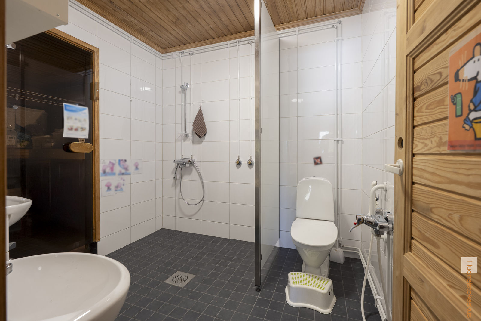 | Kylpyhuoneen kuvaus | Suihkuseinä, lattialämmitys, suihku, wc-istuin, peilikaappi, allaskaappi ja kiinteät valaisimet, seinät (kaakeli), lattiat (laatta) |