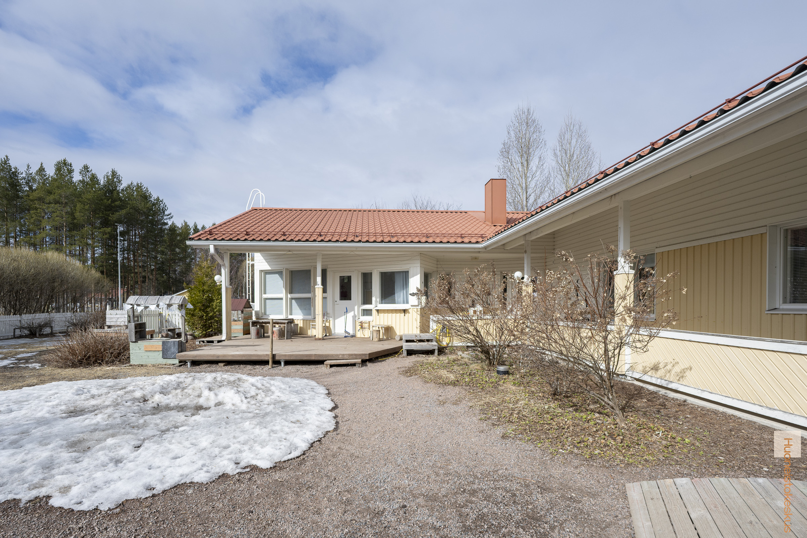 Rakennus on alun perin rakennettu omakotitaloksi, missä on kaksi asuinpuolta 120 m2 ja 60 m2 sekä yhteinen sisäänkäynti 5 m2. Huonejärjestyksenä on kuusi makuuhuonetta, kaksi olohuonetta, keittiö, kaksi kodinhoitohuonetta, pesuhuone, sauna ja kaksi wc-tilaa, joista toisessa on myös suihku. Talon yhteydessä on kaksi varastoa ja autokatos kahdelle autolle.