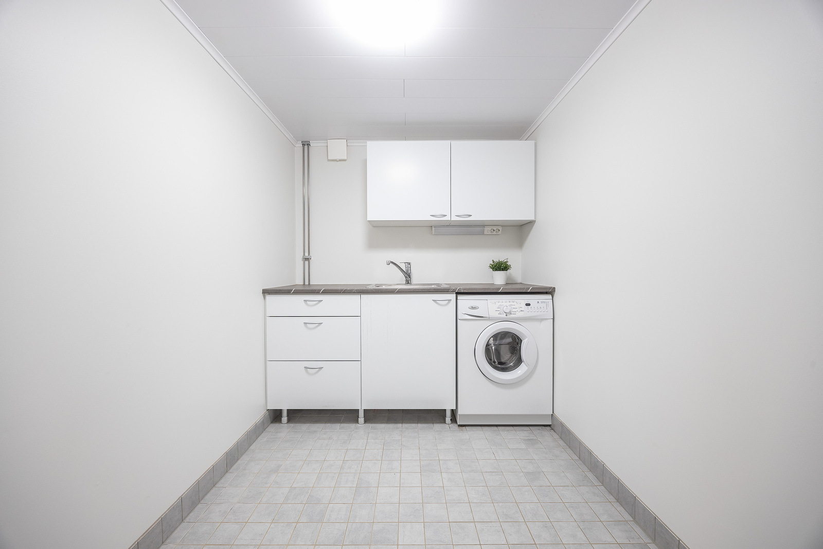 | Kodinhoitohuoneen kuvaus | Kaapistot, allas, allaskaappi, vetolaatikot ja pyykinpesukone. |