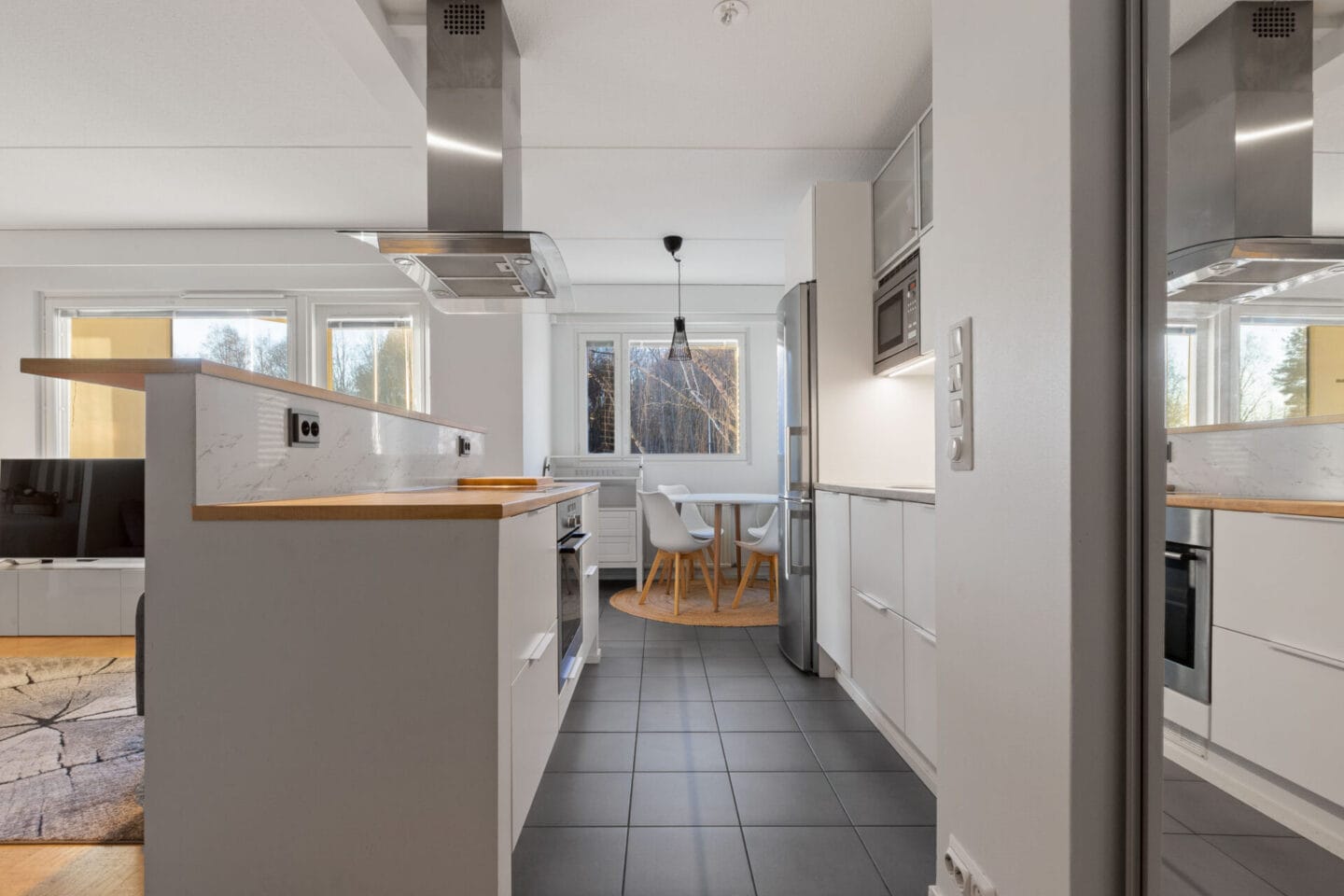 | Keittiön kuvaus | Työtasot (laminaatti), seinät (välitilalevy ja maali), lattiat (laatta), erillisuuni (Pyrolyysiuuni), jääkaappipakastin ja keraaminen indutioliesitaso, Avokeittiö, keittiöremontti tehty 2021 |