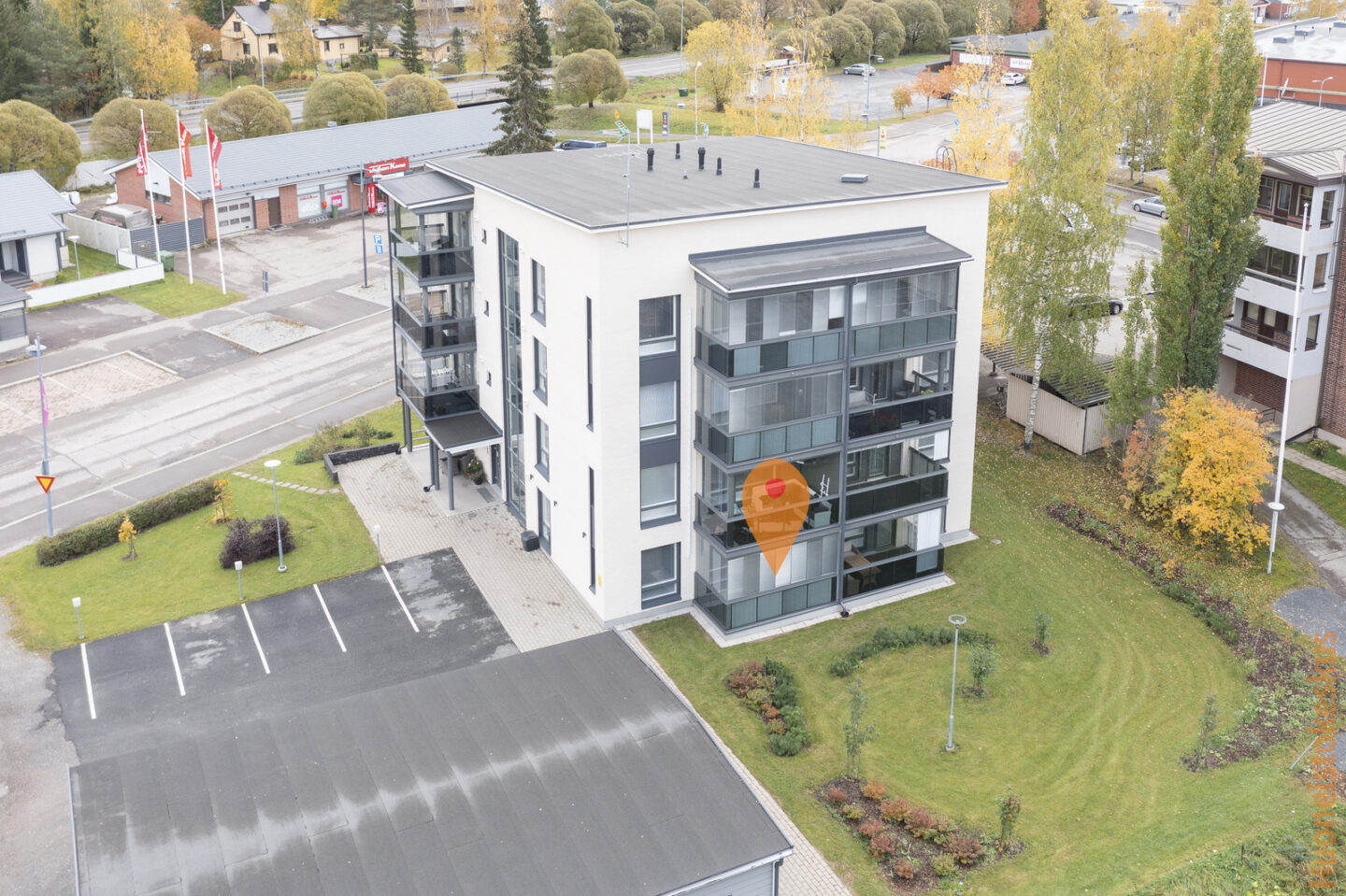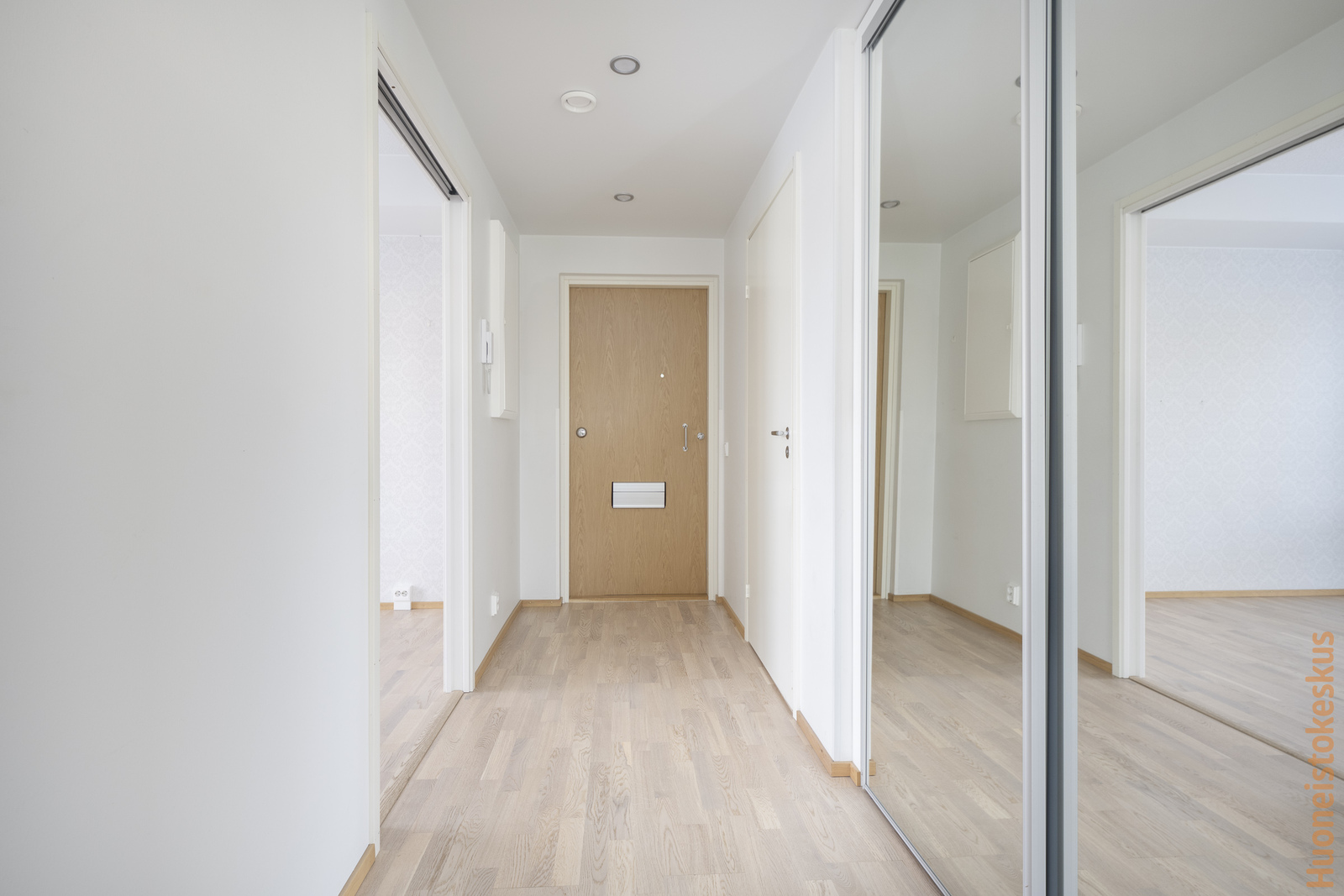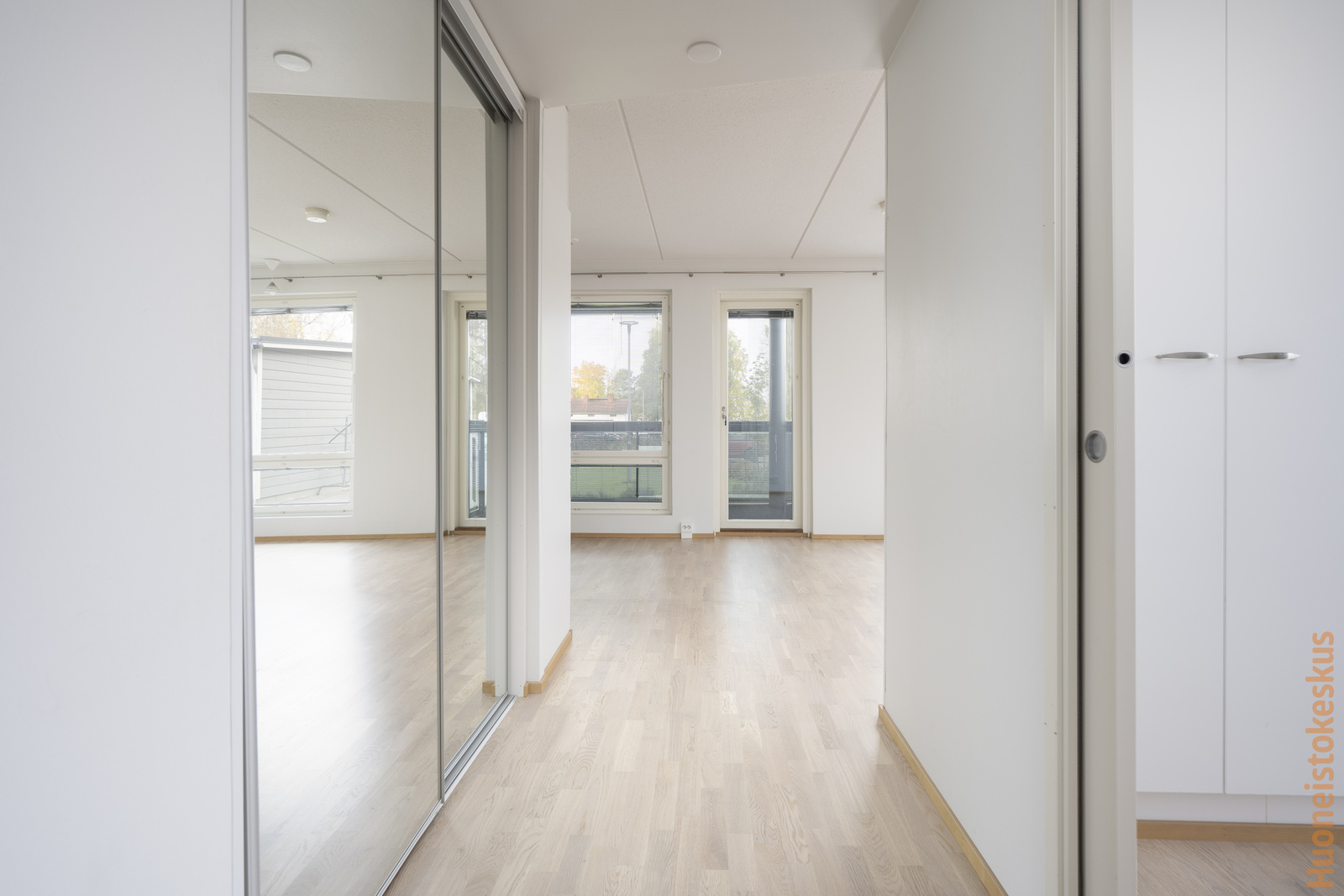 Tämä saunallinen kaksio sijaitsee 2018 rakennetun kerrostalon ensimmäisessä kerroksessa. Lämmitysmuotona on lattialämmitys kaukolämmöllä. Asuinhuoneissa lattiat ovat parkettia ja seinät on pääosin tapetoitu. Pesuhuoneessa on laatoitetut pinnat ja varusteisiin kuuluu lisäksi pyykinpesukone ja kuivausrumpu. Oma sauna on mukavaa luksusta. Keittiössä on hyvin kaappi- ja työtasotilaa. Säilytystilaa on makuuhuoneen kaapistoissa ja eteisessä peililiukuovien takana. Etelän puolella oleva lasitettu parveke on tilava ja viihtyisä oleskelutila ympäri vuoden. Huoneistoon on asennettu ilmalämpöpumppu viilennystä varten.
