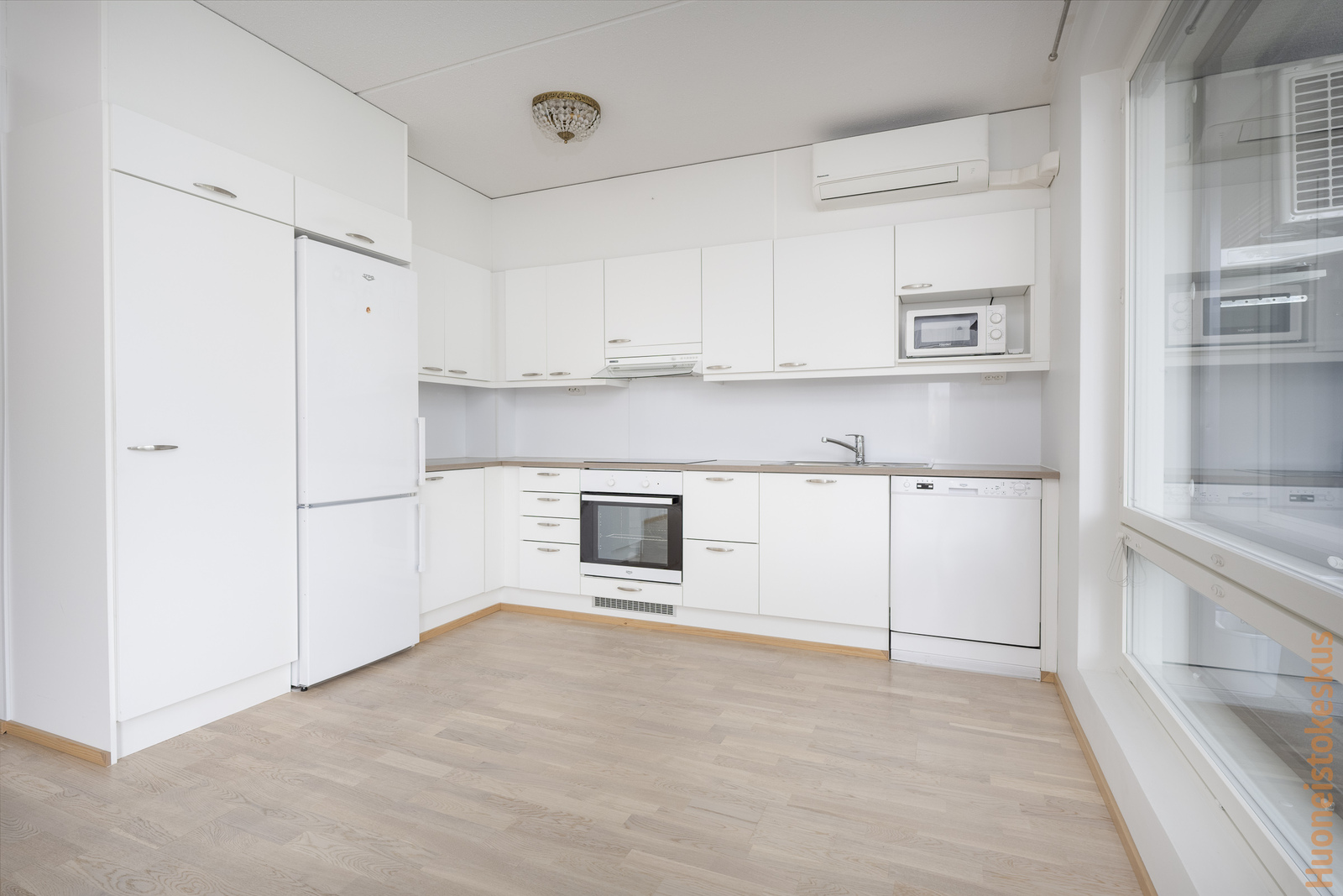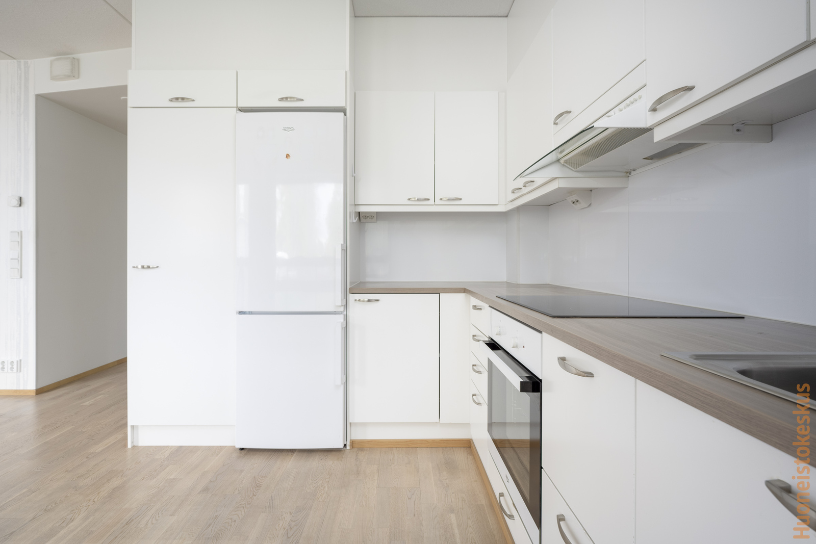 | Keittiön kuvaus | Liesi (erillisuuni, liesitaso), työtasot (laminaatti), seinät (maali), lattiat (parketti), astianpesukone, erillisuuni, jääkaappipakastin, liesituuletin ja kiinteät valaisimet, liesitaso |