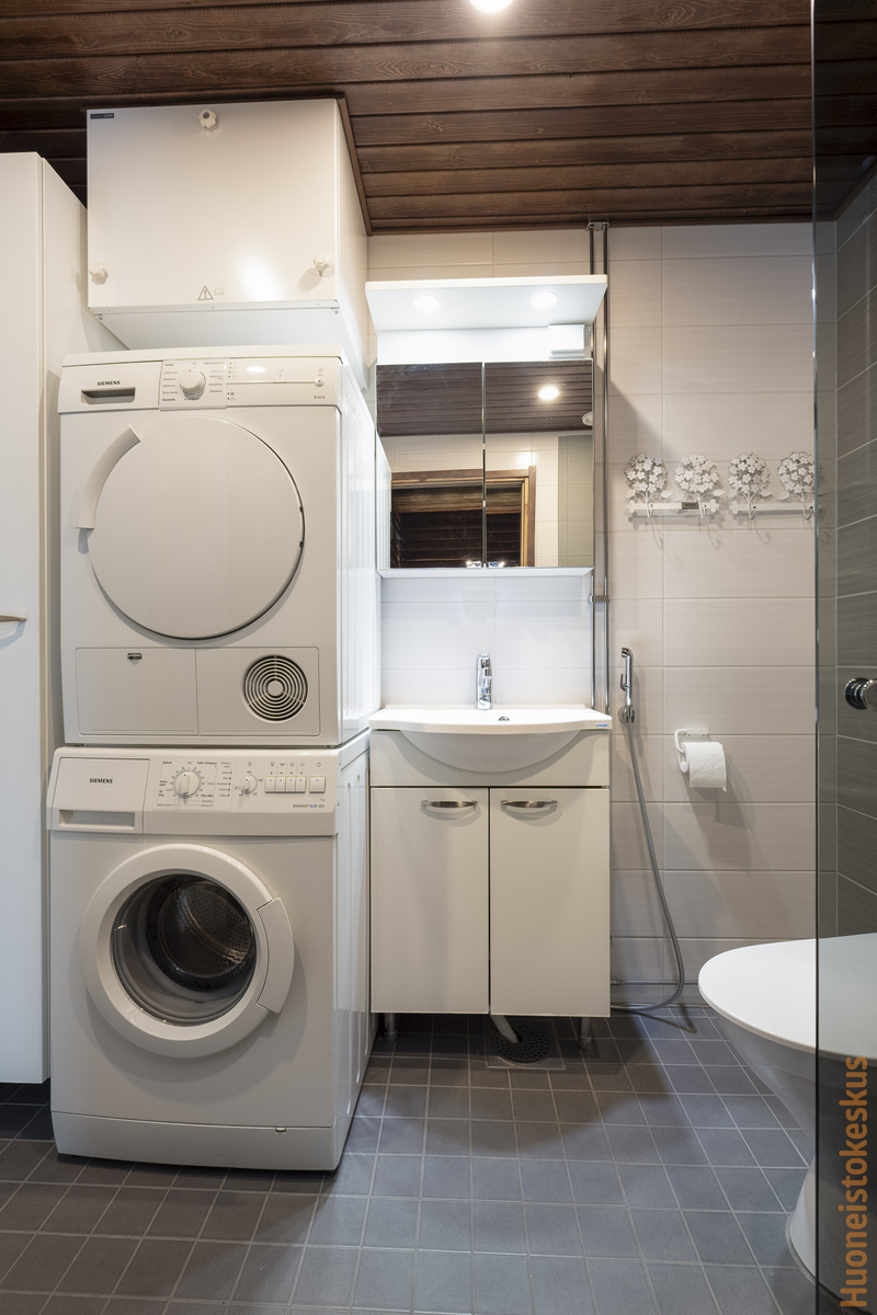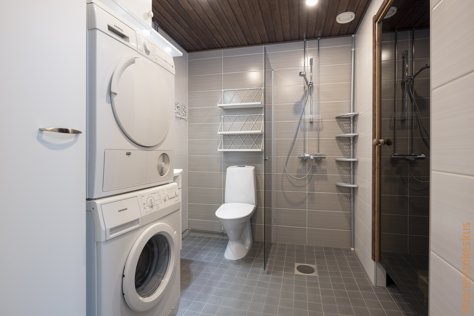 | Kylpyhuoneen kuvaus | Allaskaappi, lattialämmitys, peilikaappi, pesukoneliitäntä, pesukone, suihku, suihkuseinä, wc-istuin, kuivausrumpu, pesuallas, bidee-suihku ja kiinteät valaisimet, seinät (kaakeli), lattiat (laatta) |