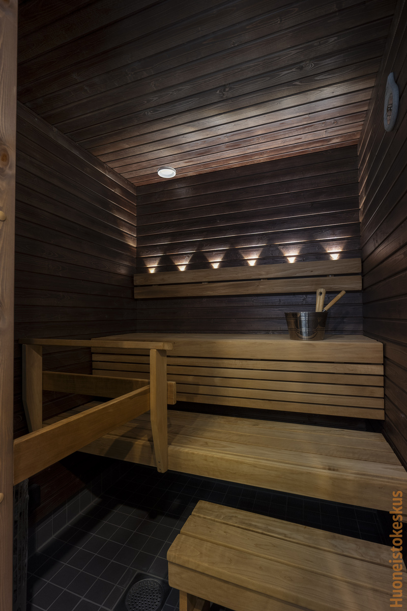 | Saunan kuvaus | Seinät (kaakeli ja paneeli), lattiat (laatta), Sähkökiuas |