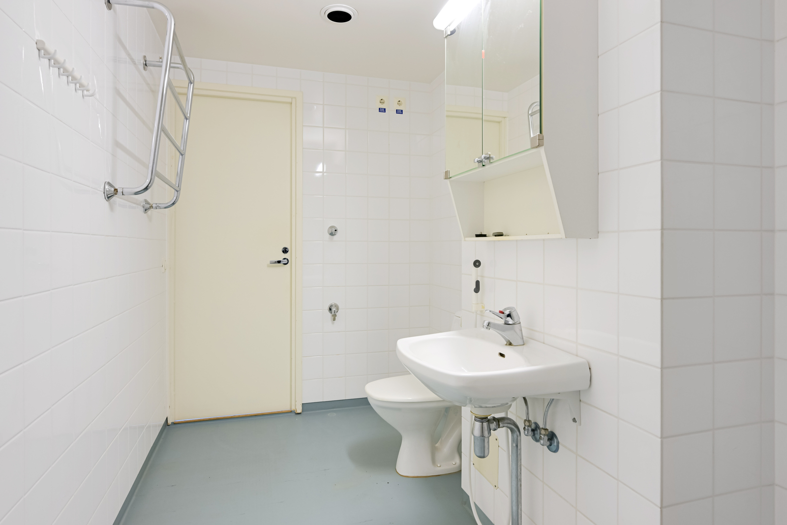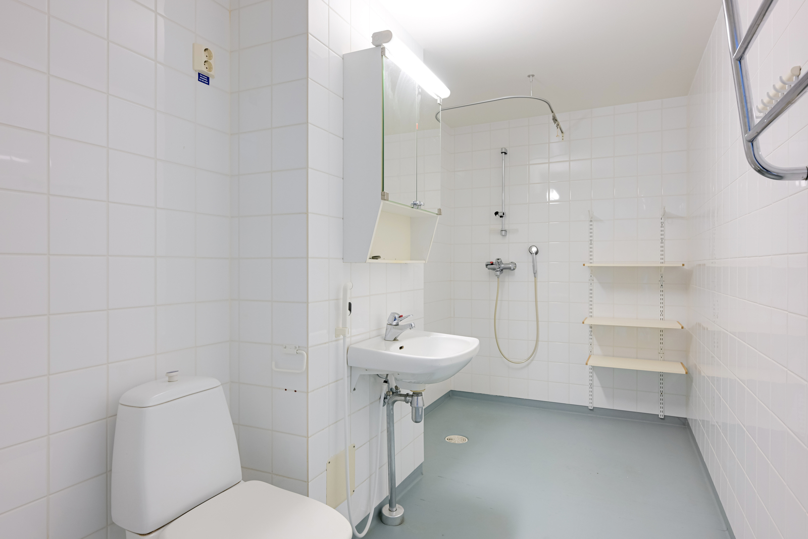 WC-istuin, pesukoneliitäntä, peili ja suihku, seinät (kaakeli), lattiat (muovimatto) |