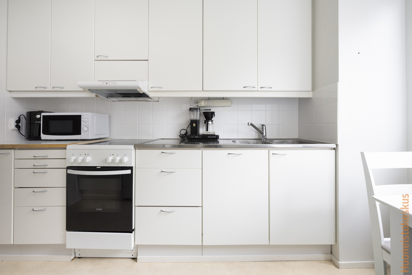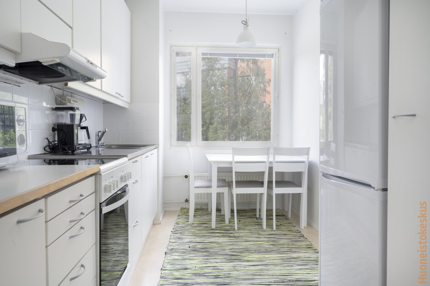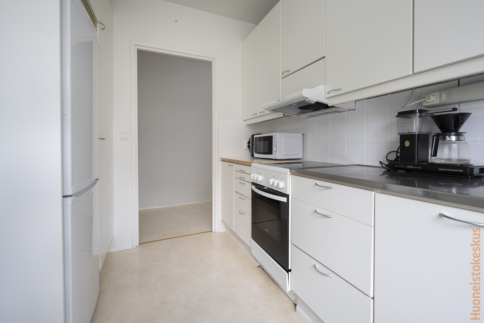| Keittiön kuvaus | Liesi (Keraaminen liesi), työtasot (laminaatti), seinät (maali), lattiat (muovimatto), liesituuletin, jääkaappipakastin, liesi ja kiinteät valaisimet, varattu paikka astianpesukoneelle |