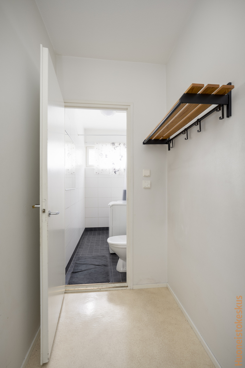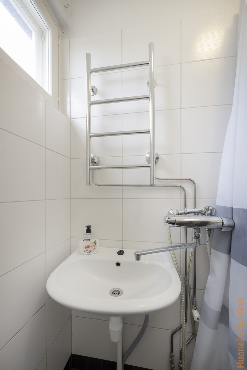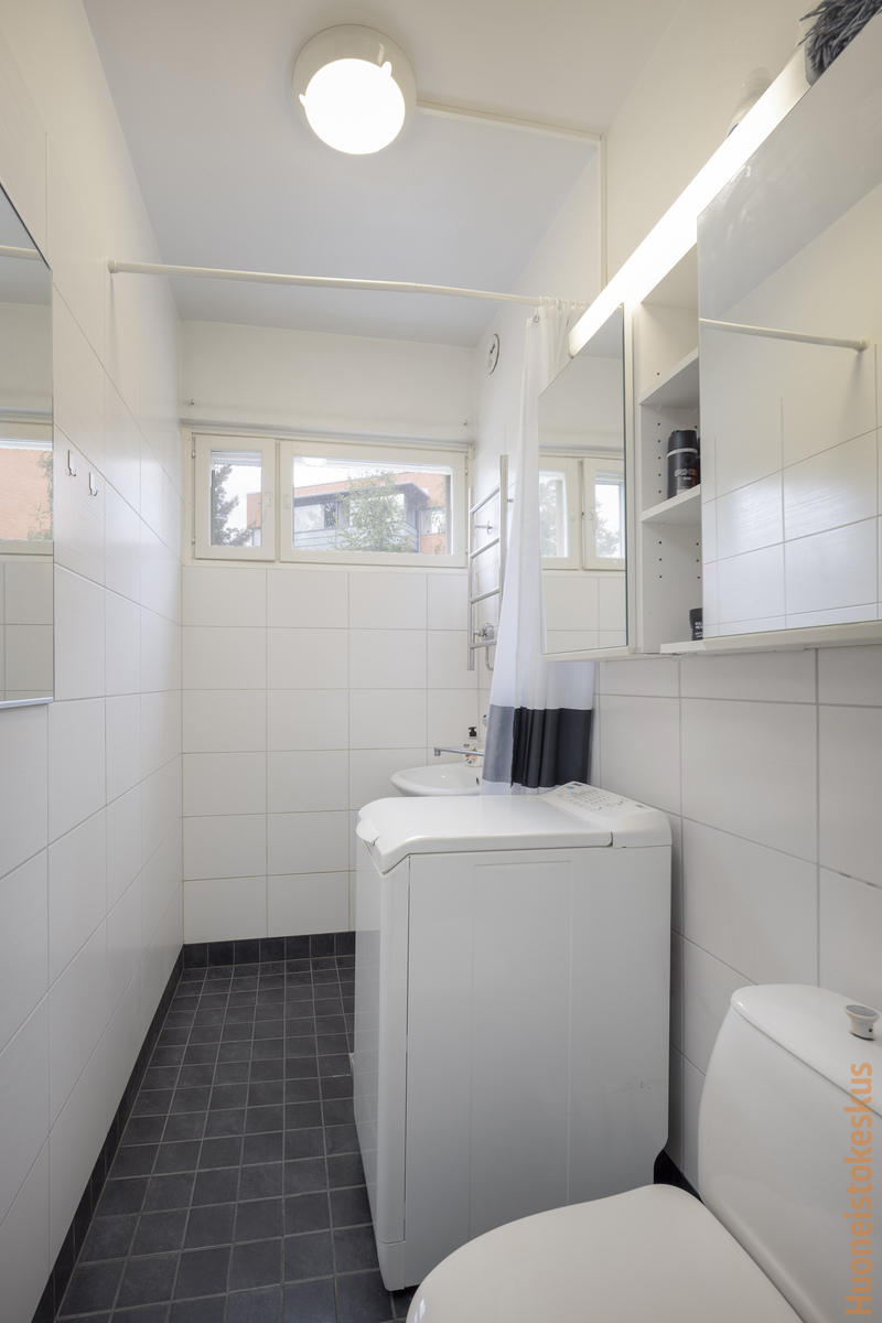 | Kylpyhuoneen kuvaus | Peilikaappi, wc-istuin, suihku, lattialämmitys, pesukoneliitäntä, pesuallas ja kiinteät valaisimet, seinät (maali ja kaakeli), lattiat (laatta) |