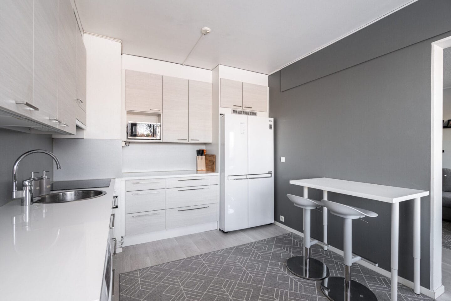 Keittiön kuvaus Liesi (Induktioliesi), työtasot (laminaatti), seinät (maali), lattiat (laminaatti), jääkaappipakastin, Keittiö uusittu kodinkoneineen 2017