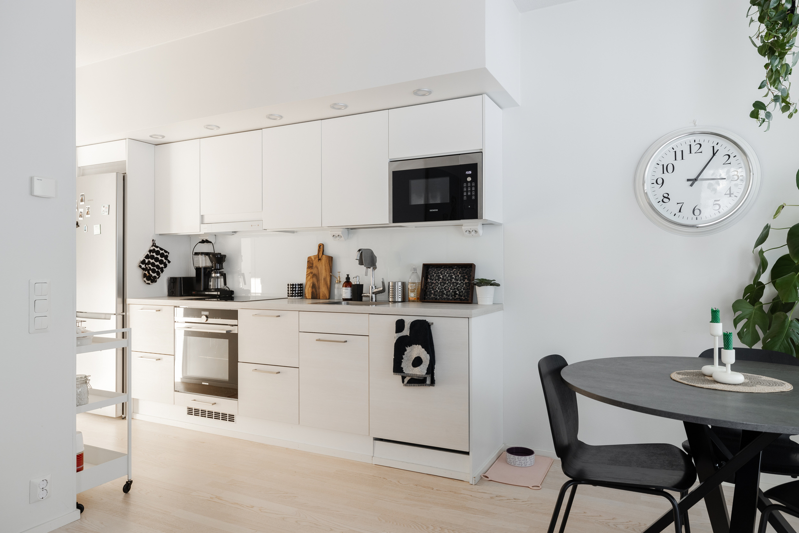 | Keittiön kuvaus | Liesi (Keraaminen liesi ja erillisuuni), työtasot (laminaatti), seinät (maali), lattiat (parketti), jääkaappipakastin, erillisuuni, astianpesukone, mikroaaltouuni ja liesituuletin / hormi |