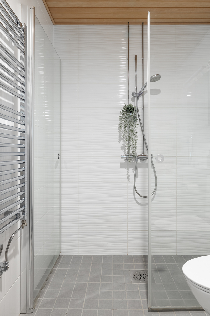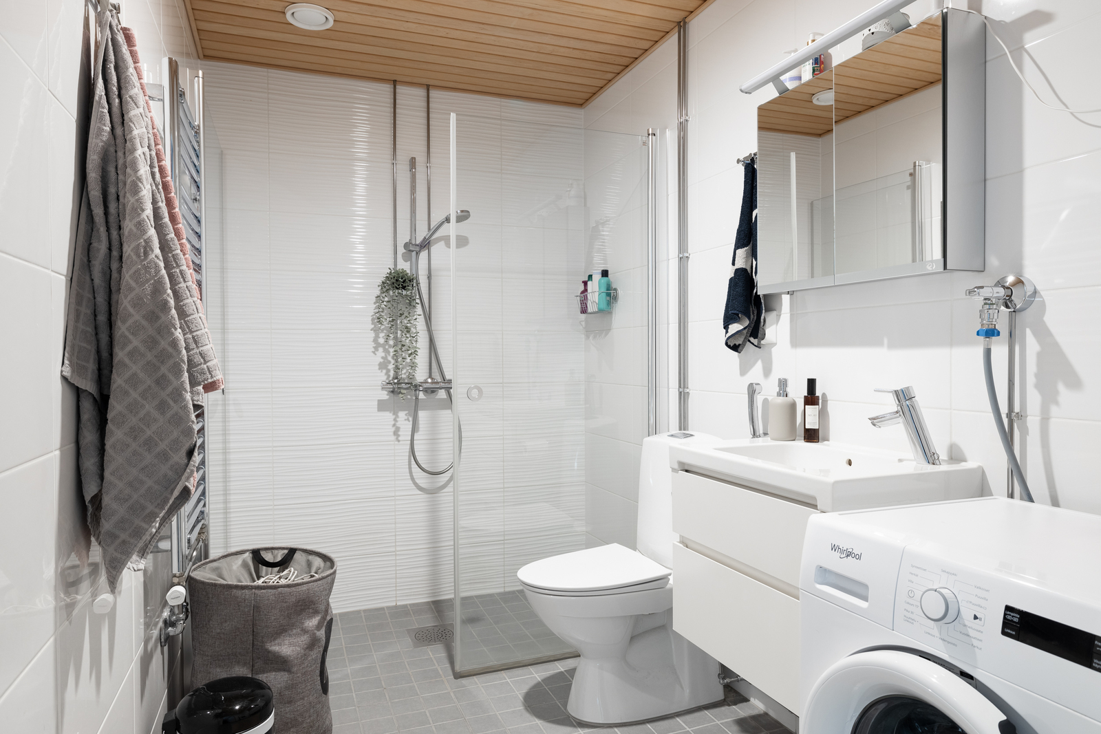 | Kylpyhuoneen kuvaus | Pesukoneliitäntä, wc-istuin, peilikaappi, suihku, allaskaappi ja lattialämmitys, seinät (kaakeli), lattiat (laatta) |