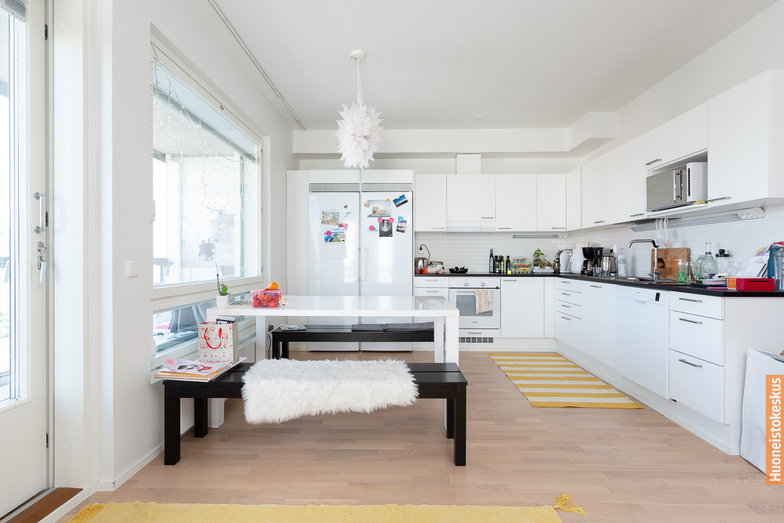Liesi (Keraaminen liesi ja erillisuuni), seinät (maali), lattiat (parketti), erillisuuni, erillinen pakastin, liesituuletin, jääkaappi, astianpesukone ja kiinteät valaisimet |