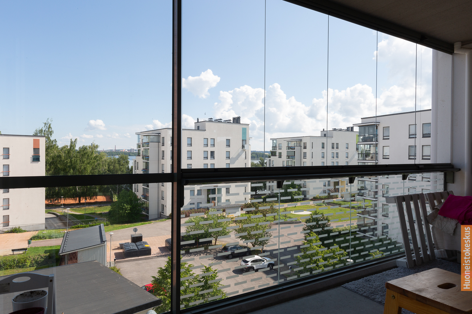 Tässä kauniissa kodissa on hyvä varustelutaso, laadukkaat materiaalit, oma sauna, erillinen wc ja iso lasitettu parveke järvinäkymin.