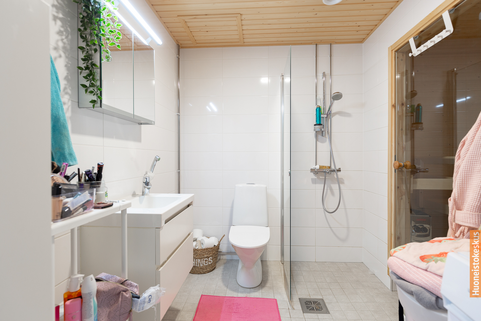 Suihku, wc-istuin, lattialämmitys, peilikaappi, pesukoneliitäntä, suihkuseinä ja allaskaappi, seinät (kaakeli), lattiat (laatta) |