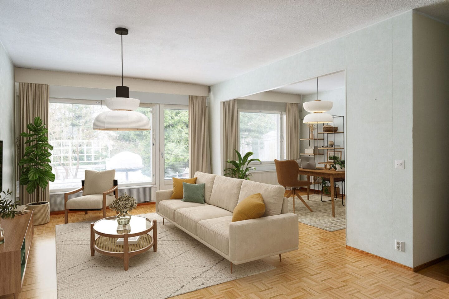 | Olohuoneen kuvaus | Seinät (maali ja tapetti), lattiat (parketti) |