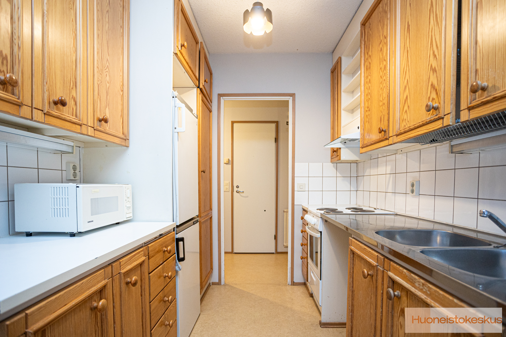 Liesi (Sähköhella), työtasot (laminaatti), seinät (maali), lattiat (muovimatto), jääkaappipakastin, liesi, mikroaaltouuni ja liesikupu |