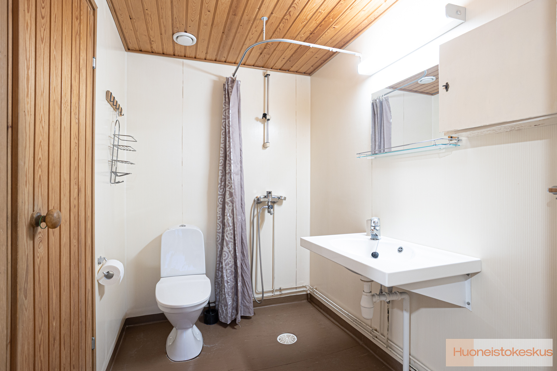 Suihku, wc-istuin, pesukoneliitäntä ja peilikaappi, seinät (muovimatto), lattiat (muovimatto) |