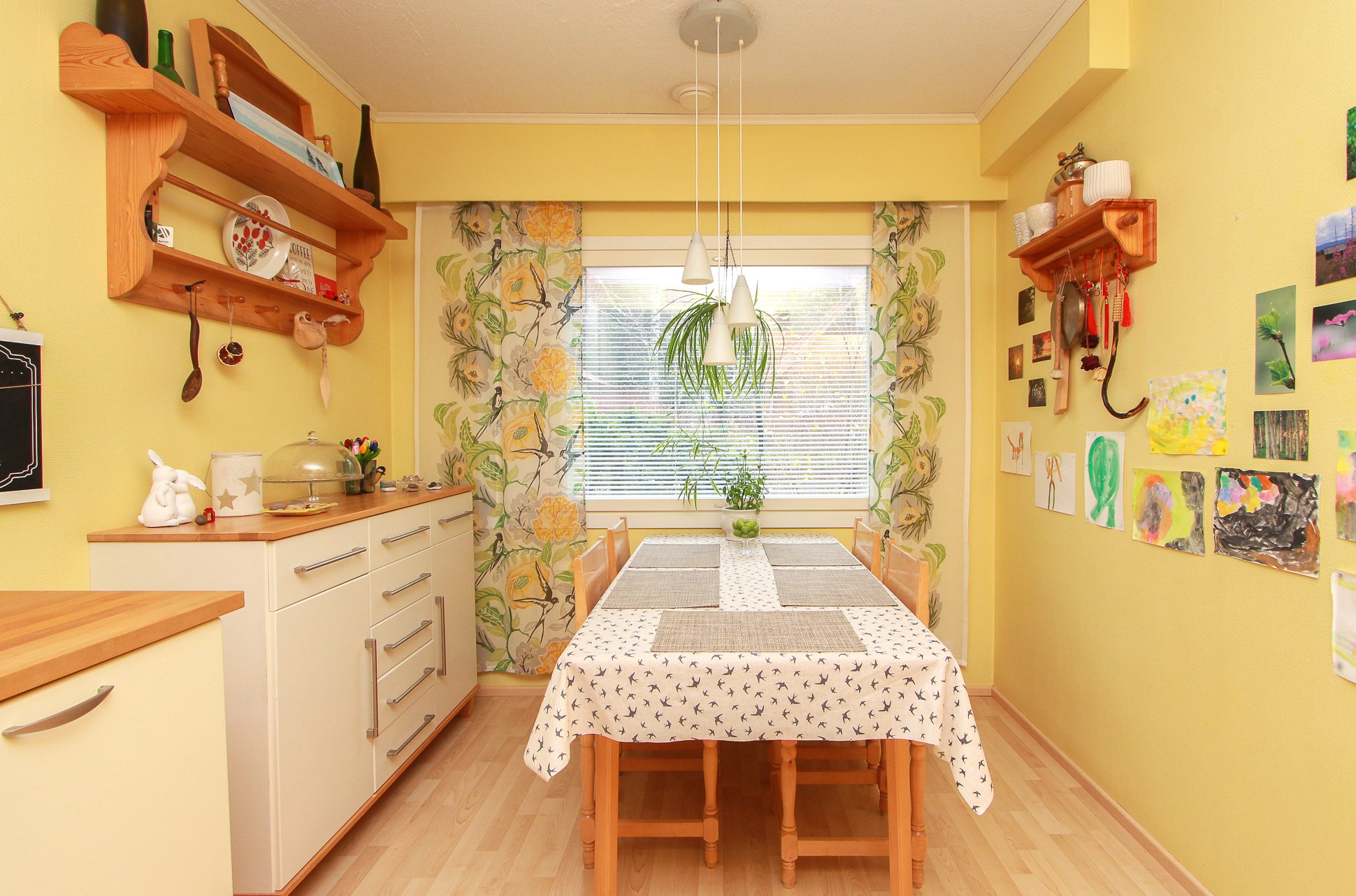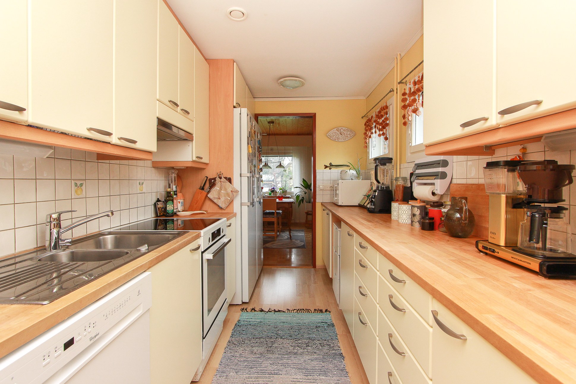 | Keittiön kuvaus | Liesi (Induktioliesi), työtasot (puu), seinät (kaakeli, tapetti ja maali), lattiat (laminaatti), jääkaappi, erillinen pakastin, liesi, liesituuletin ja astianpesukone, Keittiössä todella runsaasti säilytyskaappeja ja työtasoja ruuanlaittoon ja leipomiseen. Kadun puoleisessa päädyssä yksi paikka ruokapöydälle ja toinen avoimessa ruokailutilassa tilavan olohuoneen yhteydessä. Kadunpuoleinen ruokailutila toiminut ennen makuuhuoneena. Väliseinä purettu rakennusluvalla. |
