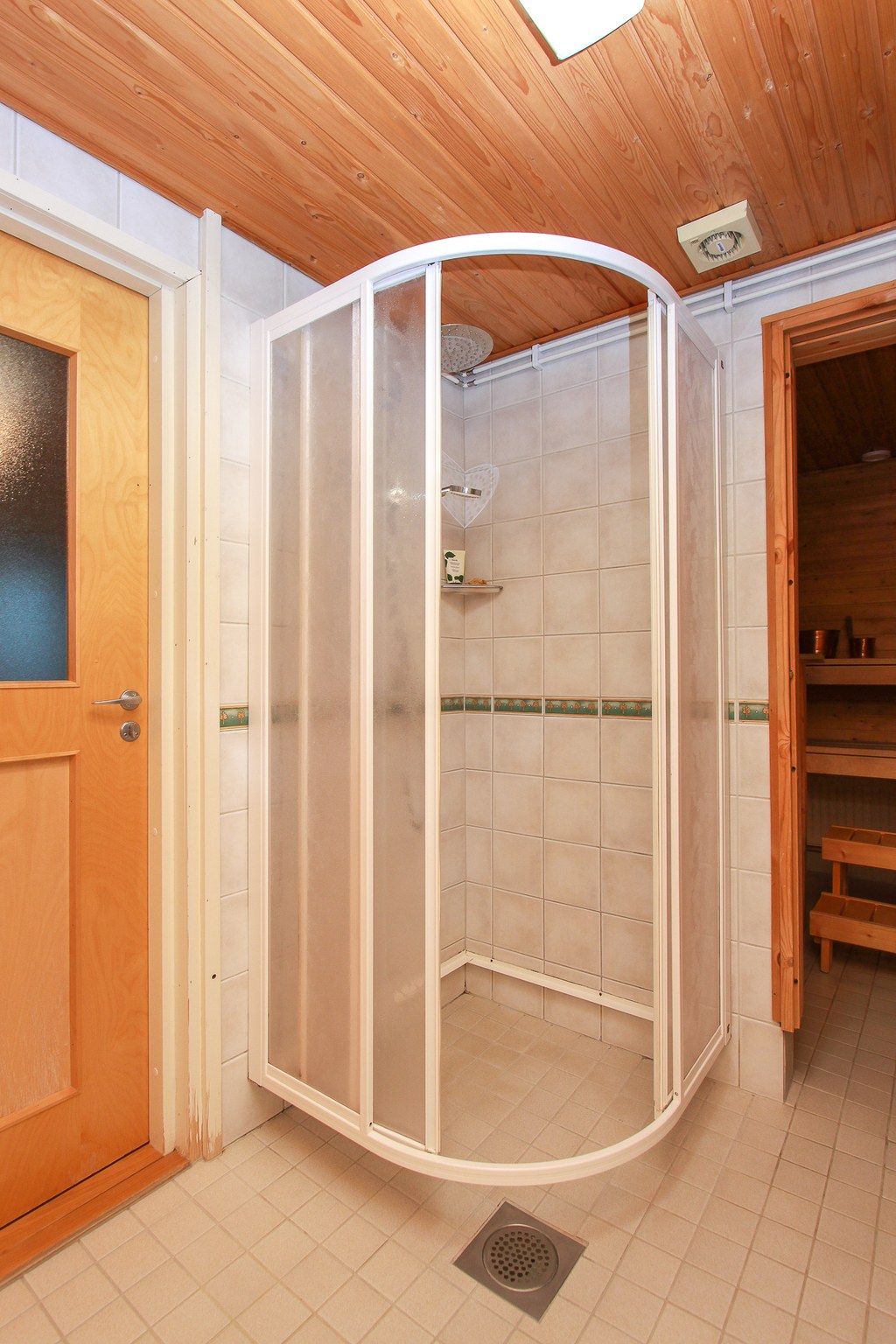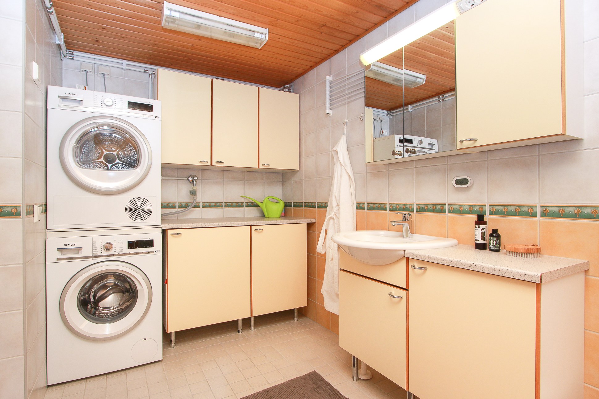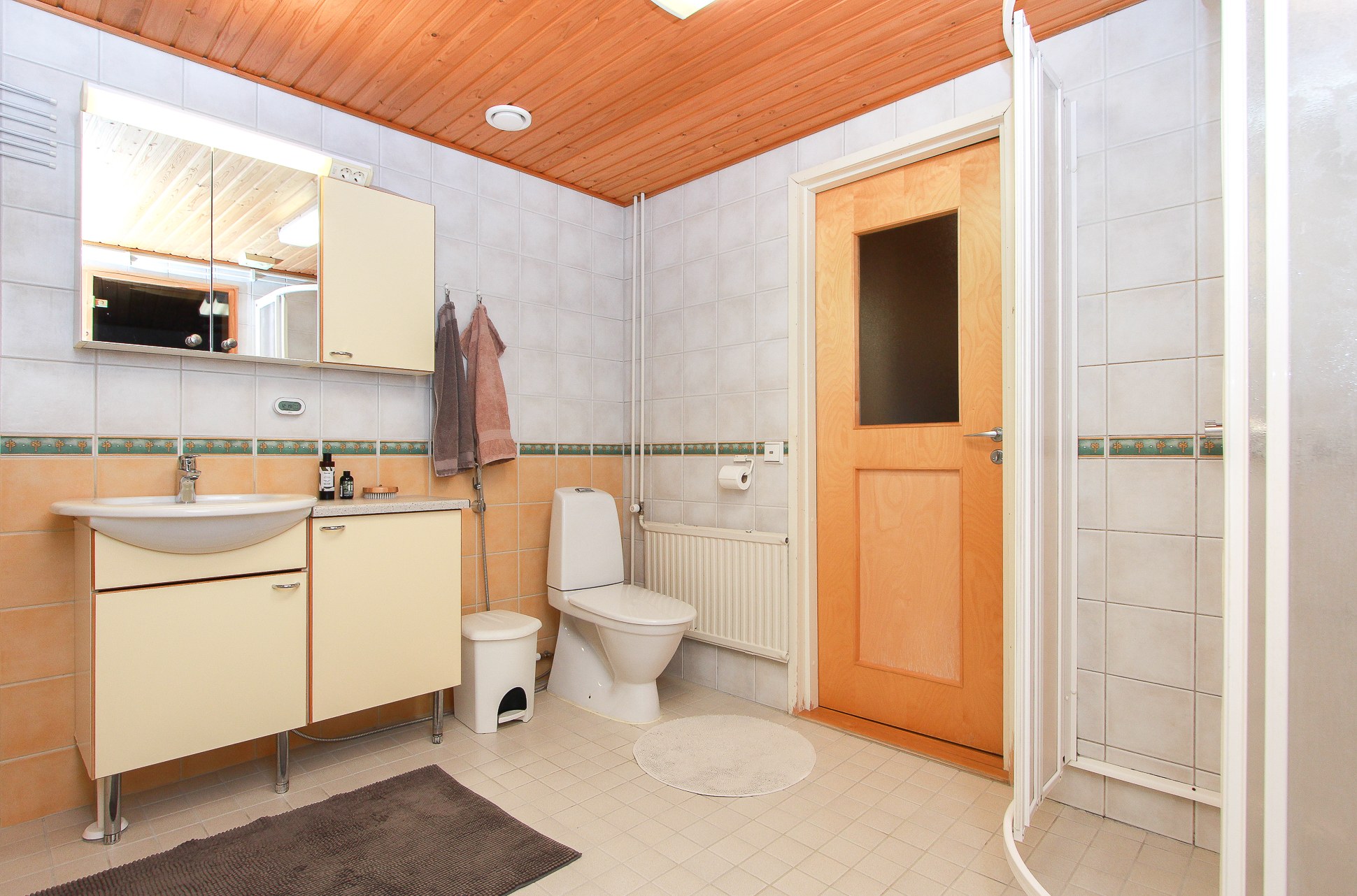 | Kylpyhuoneen kuvaus | WC-istuin, peilikaappi, suihku, suihkukaappi, bidee-suihku, pesukoneliitäntä, pesuallas ja allaskaappi, seinät (kaakeli), lattiat (laatta), Tilava pesuhuone, jonka yhteydessä toimiva kodinhoitotila. |