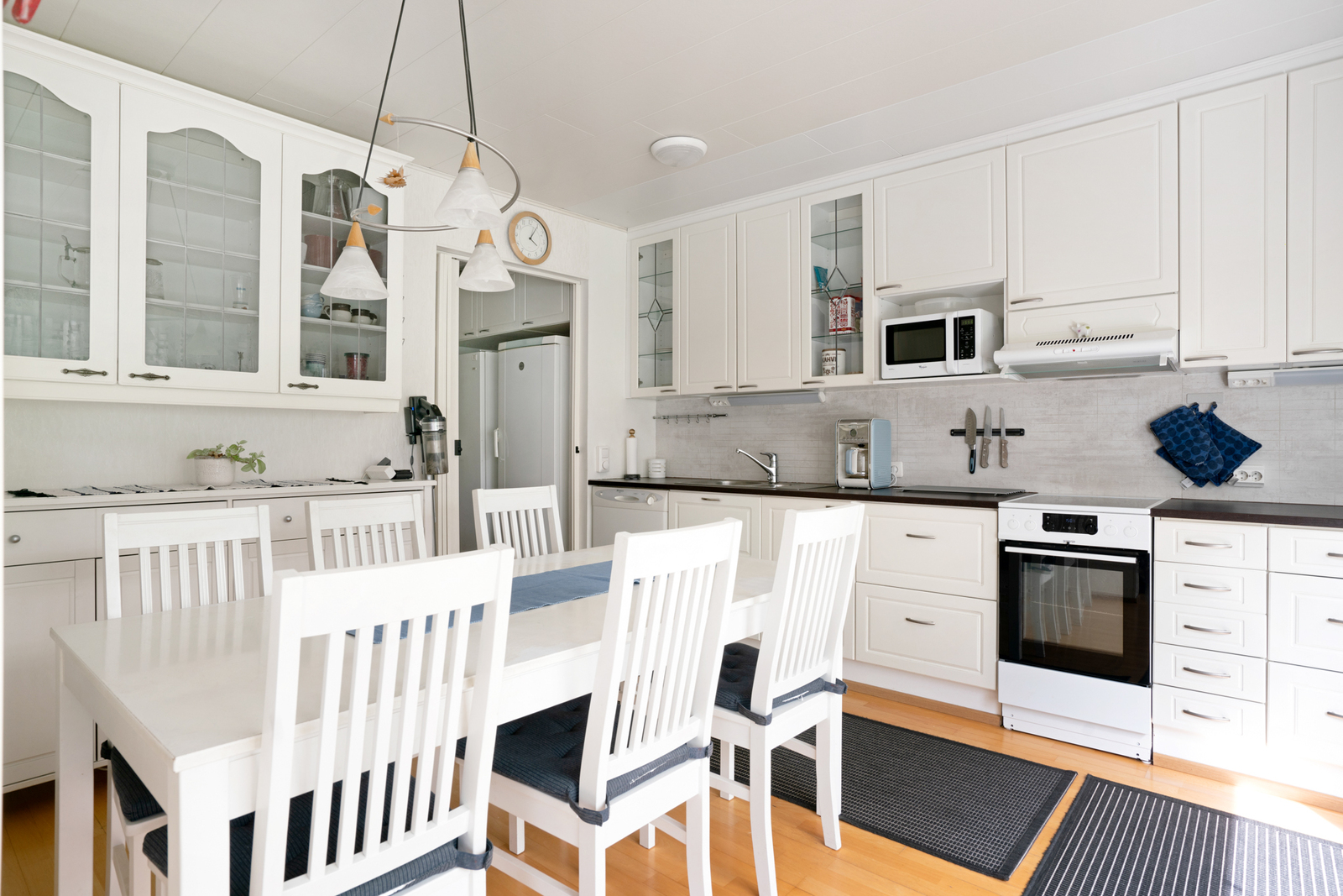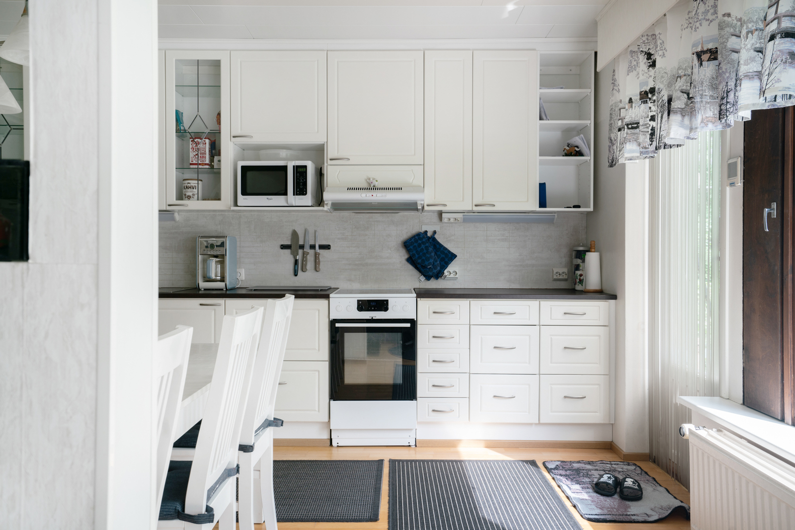 | Keittiön kuvaus | Liesi (Keraaminen liesi), työtasot (laminaatti), seinät (tapetti), lattiat (parketti), astianpesukone, jääkaappi, erillinen pakastin ja irralliset kaapistot, kiinteät valaisimet, liesituuletin / hormi, Keittiönkaapit ja liesituuletin uusittu 2014. Keraaminen liesi vuodelta 2020. |