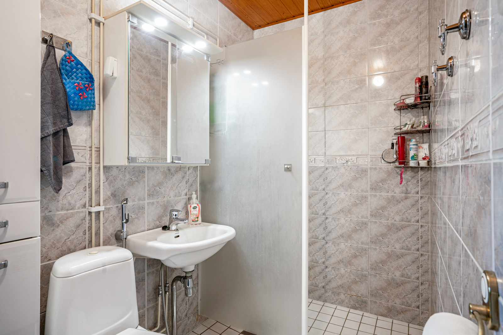 | Kylpyhuoneen kuvaus | Suihkuseinä, wc-istuin, suihku, allaskaappi, lattialämmitys ja kiinteät valaisimet, seinät (kaakeli), lattiat (laatta) |
