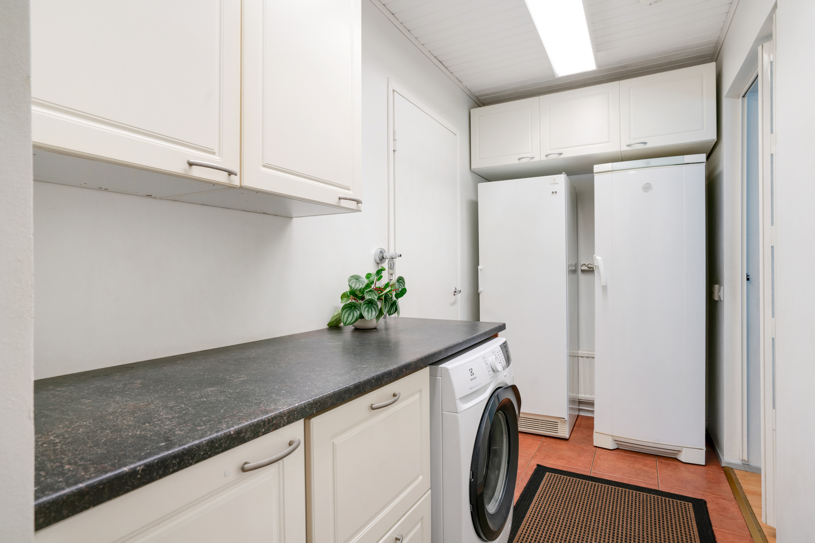 | Kodinhoitohuoneen kuvaus | Pyykkikaapit, pöytätaso ja pesukoneliitäntä, lattiat (laatta), seinät (maali) |