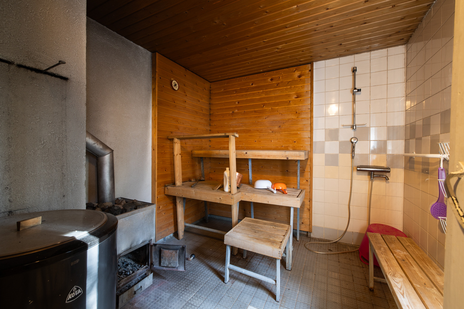 | Saunan kuvaus | Seinät (kaakeli ja puu), lattiat (laatta), Puukiuas, Pesutilat saunan yhteydessä |