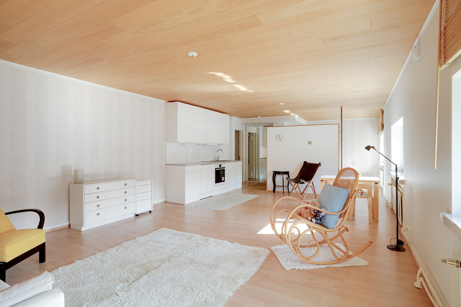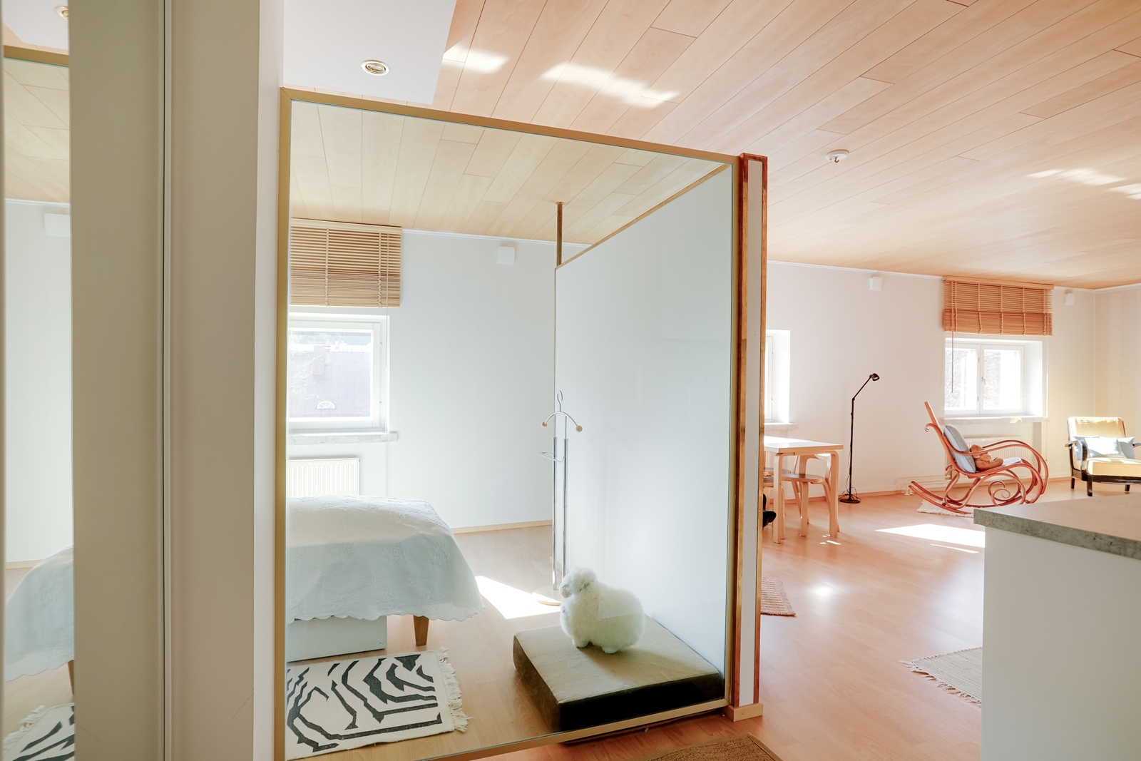 Tämä huoneisto on virallisesti yksiö, mutta makuutila on erotettu näppärästi kevytrakenteisella tilanjakajalla oleskelutiloista.