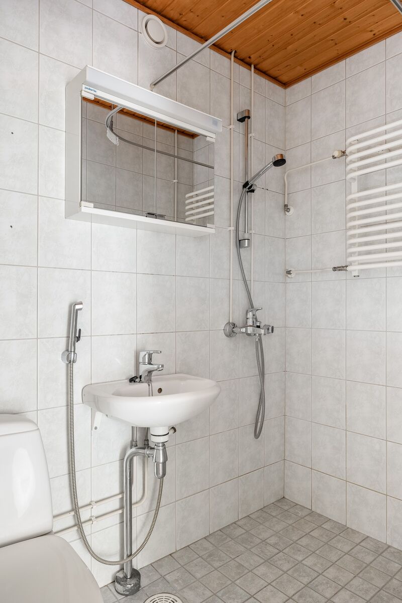 WC-istuin, peilikaappi, suihku ja pesukoneliitäntä, seinät (kaakeli), lattiat (laatta) |