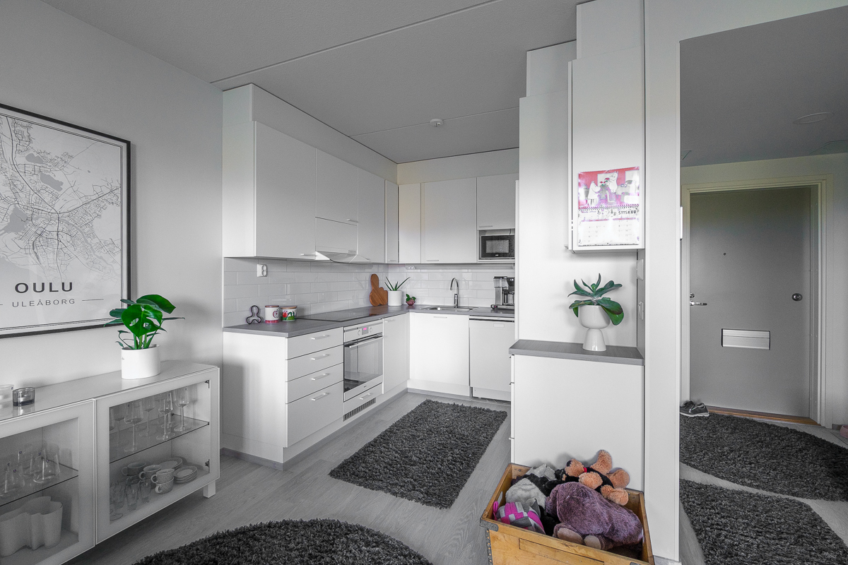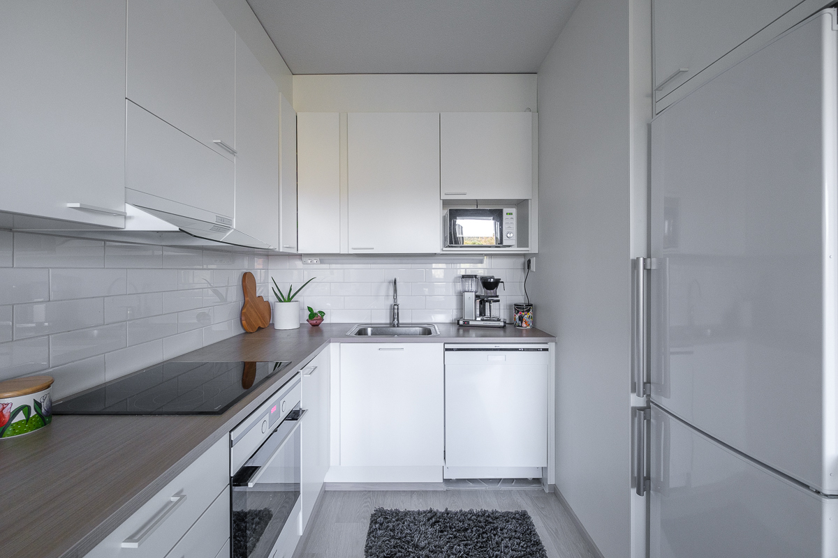 Liesi (Keraaminen liesi), työtasot (laminaatti), lattiat (laminaatti), astianpesukone, jääkaappipakastin ja kiinteät valaisimet |